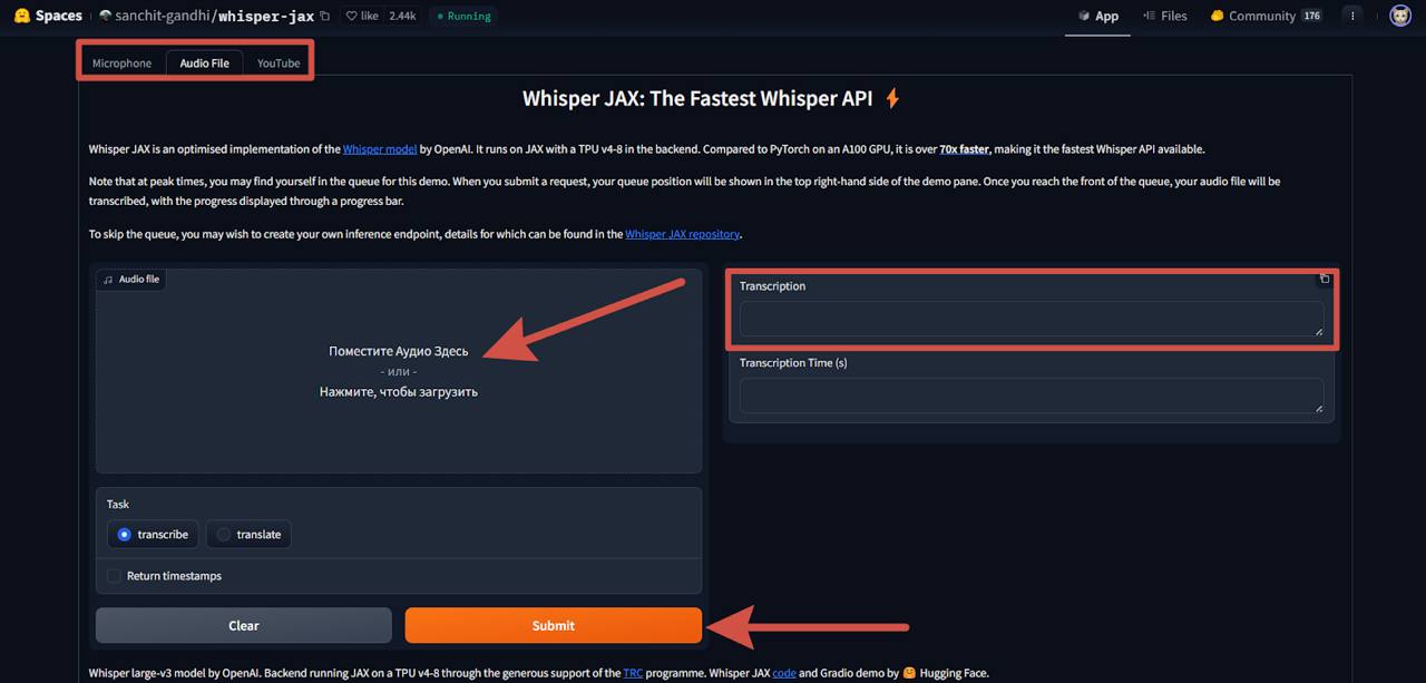 Переходим на в пространство Whisper Jax и сверху выбираем, откуда будет поступать аудио: запись с микрофона, файл или ссылка на YouTube видео.