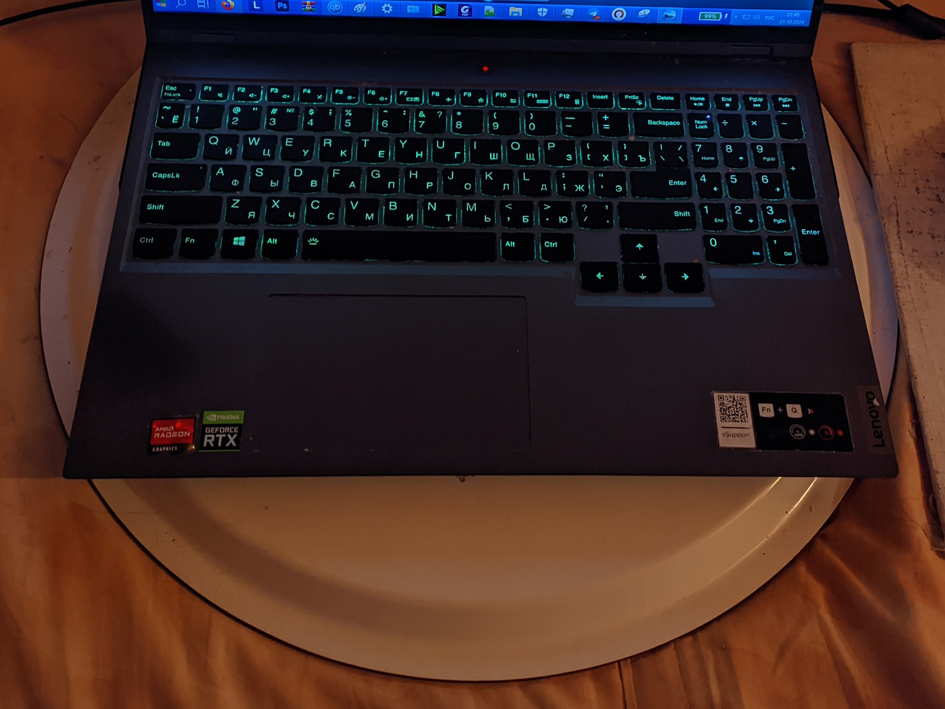 Современные ноутбуки, особенно игровые, черпают и выбрасывают воздух для охлаждения буквально из всех щелей: снизу, сзади, с боков, из щелей в клавиатуре и даже используя металл шасси как часть радиатора. Поэтому важно, чтобы ноутбук стоял на плоской, твёрдой поверхности, и имел возможность свободно черпать воздух снизу (а также, само собой, с других сторон).