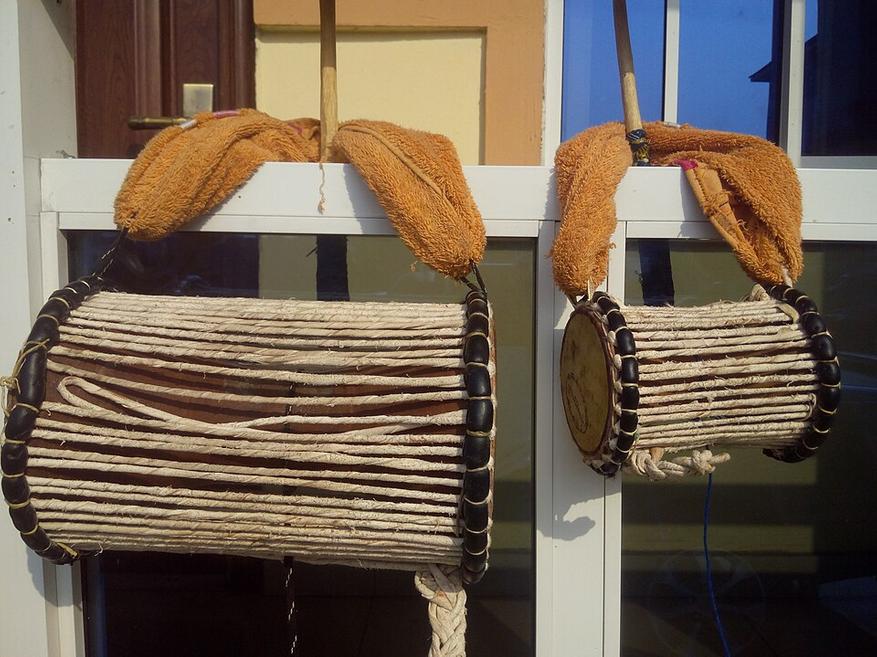Использовали «говорящий барабан» — вытянутый, песочнообразной формы, с мембранами по краям. Его держали под мышкой, натягивали верёвки, соединяющие края, и могли прямо во время удара регулировать натяжение — значит, и высоту звука.