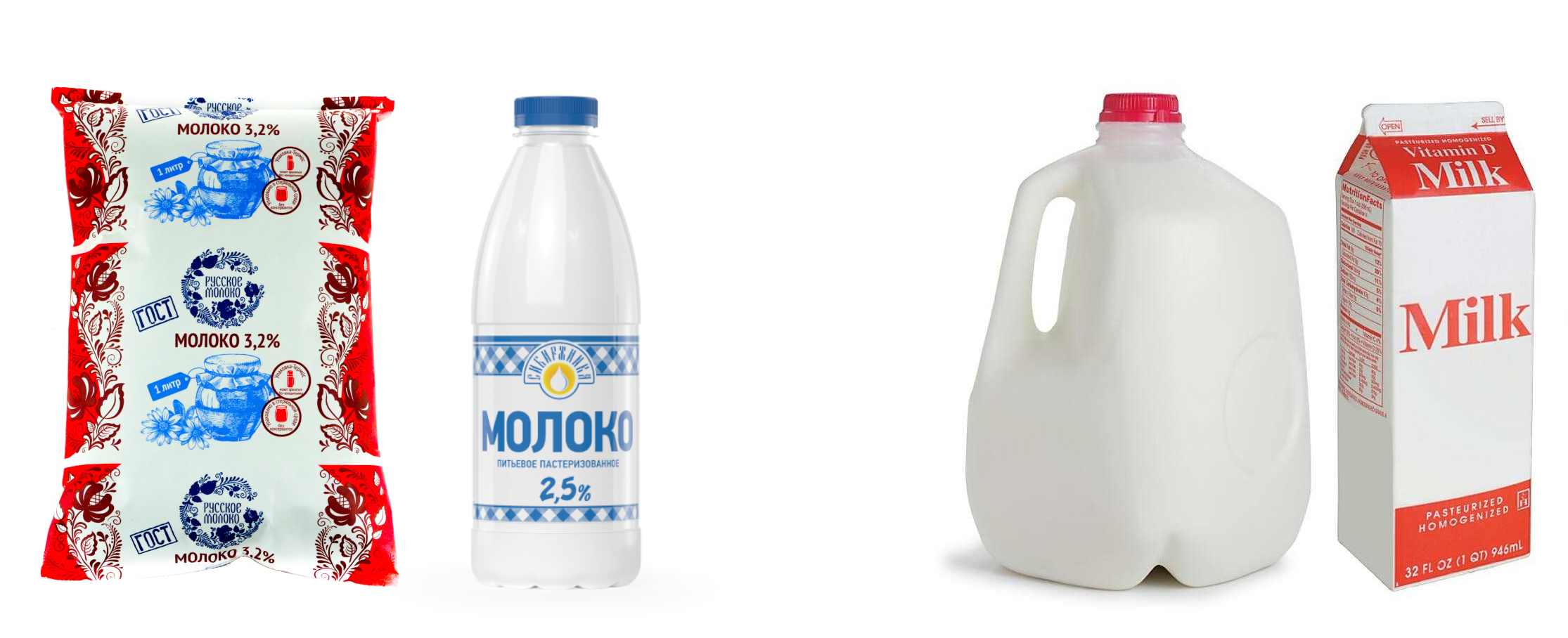 Молоко, произведённое в России, натурально. Оно отличается высоким процентом жира (в среднем 3,5-4,5%), более питательно и не содержит опасных для человека добавок. Американское же, напротив, может содержать гормоны роста и менее питательно. Выделяется разнообразием вкусов: шоколадное, миндальное