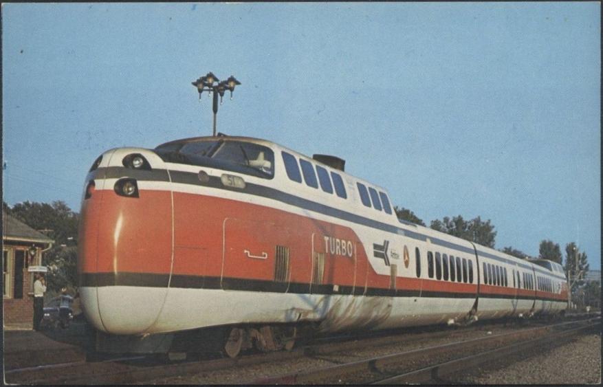 Его конкурент в лице корпорации United Aircraft Corporation (UAC), напротив, сделал ставку на авиационные технологии и предложил газотурбинный поезд, получивший название Turbotrain. Первоначально разработкой занималось подразделение Corporate Systems Center, однако затем она перешла к другому именитому подразделению UAC — Sikorsky Aircraft. В отличие от Японии американцы решили пойти, как им казалось, более простым и дешевым путем. Они решили использовать уже существующие железнодорожные пути, а не строить новые. Это решение сразу же породило целый комплекс инженерных проблем. Старые ж/д пути отличались крутыми поворотами, переездами и изношенными рельсами. Всё это в комплексе делало движение на высоких скоростях небезопасным. Необходимо было искать решение этой проблемы, и оно пришло. Инженерами была внедрена инновационная система наклона вагонов, которая ещё в 1950-х годах была разработана инженерами компании Chesapeake & Ohio Railway. И это было ещё далеко не всё. В Turbotrain применили необычную схему: вместо классических двухосных тележек использовались одноосные, расположенные между вагонами. Подвеска с пневматическими подушками заставляла кузов наклоняться внутрь поворота под действием центробежной силы, позволяя проходить кривые участки железнодорожных путей на повышенных скоростях. Однако такая конструкция усложняла эксплуатацию. Составы не могли легко расцепляться, поэтому каждый поезд имел два головных вагона. При смене направления движения машинисты просто переходили в другой локомотив. Обтекаемая носовая часть оснащалась распашными дверями, что позволяло сцеплять два состава в один.