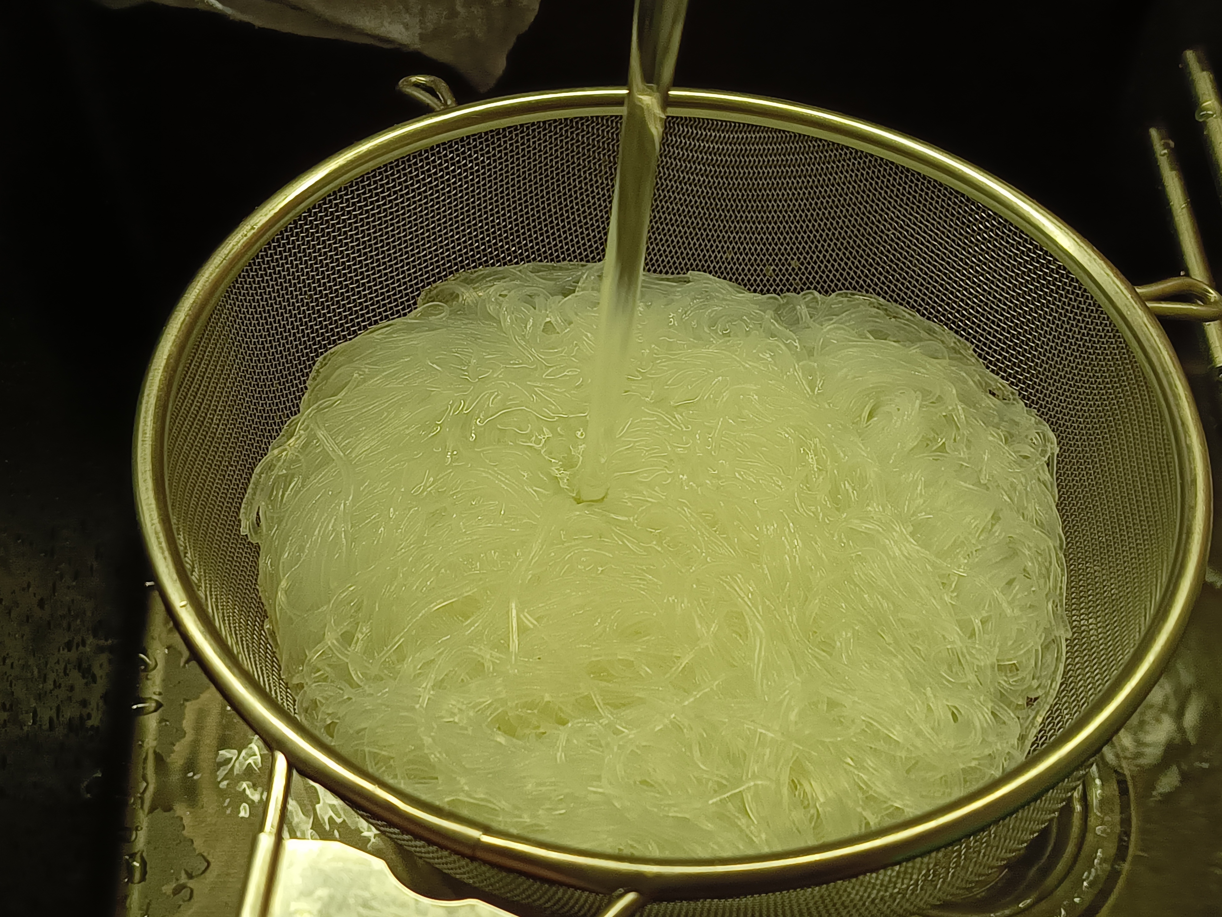 Фунчозу выкладывают в глубокую чашку и заливают кипятком примерно на пять минут. Этого времени вполне достаточно, чтобы она стала мягкой и приобрела нужную текстуру. По истечении указанного времени лапшу необходимо промыть под холодной проточной водой.