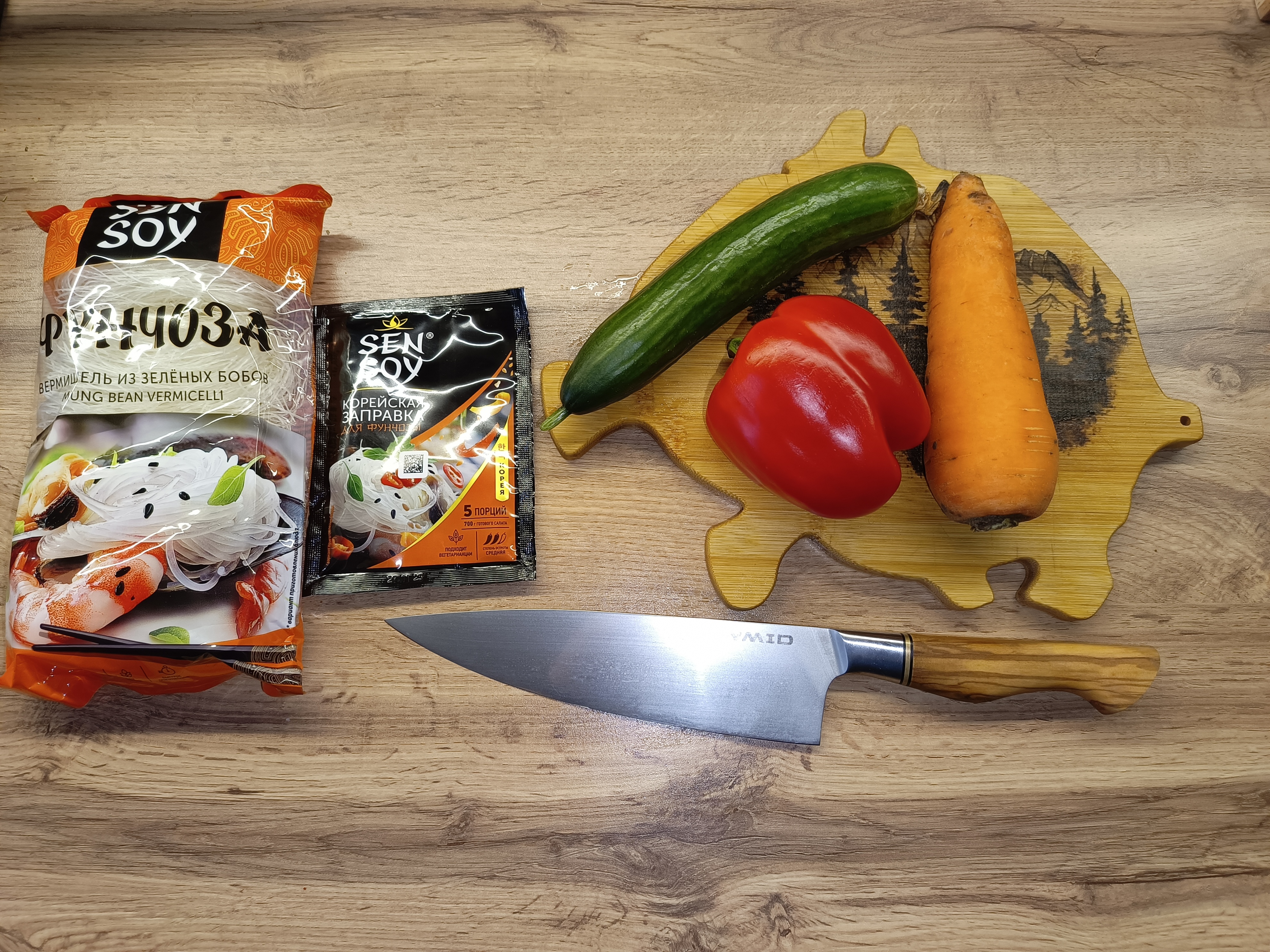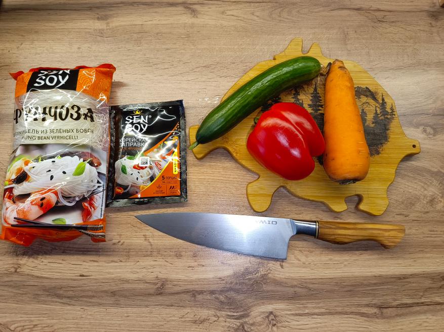 Для приготовления я, разумеется, заранее покупаю саму фунчозу и специальный соус для её приготовления. Дополнительно понадобятся морковь, болгарский перец, огурец и чеснок. Все овощи необходимо нарезать тонкой соломкой, чтобы салат получился нежным и равномерным по текстуре, после чего смешать их и заправить специями. Чеснок следует пропустить через чеснокодавку, чтобы он лучше раскрыл свой аромат.