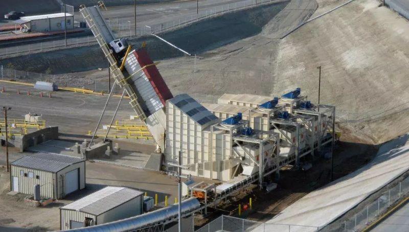 Самосвал, сама концепция, созданы как бы не просто так. Как раз для того, что бы вот такие вот намного дорогостоящие конструкции не ставить, занимая приличный кусок площади. Да, в стандартный самосвал помещается меньше, чем в контейнеровоз. Ну нанял ты два самосвала, а не один. И при этом сгружать сырец можно на любом участке, без всяческих мудренных устройств.