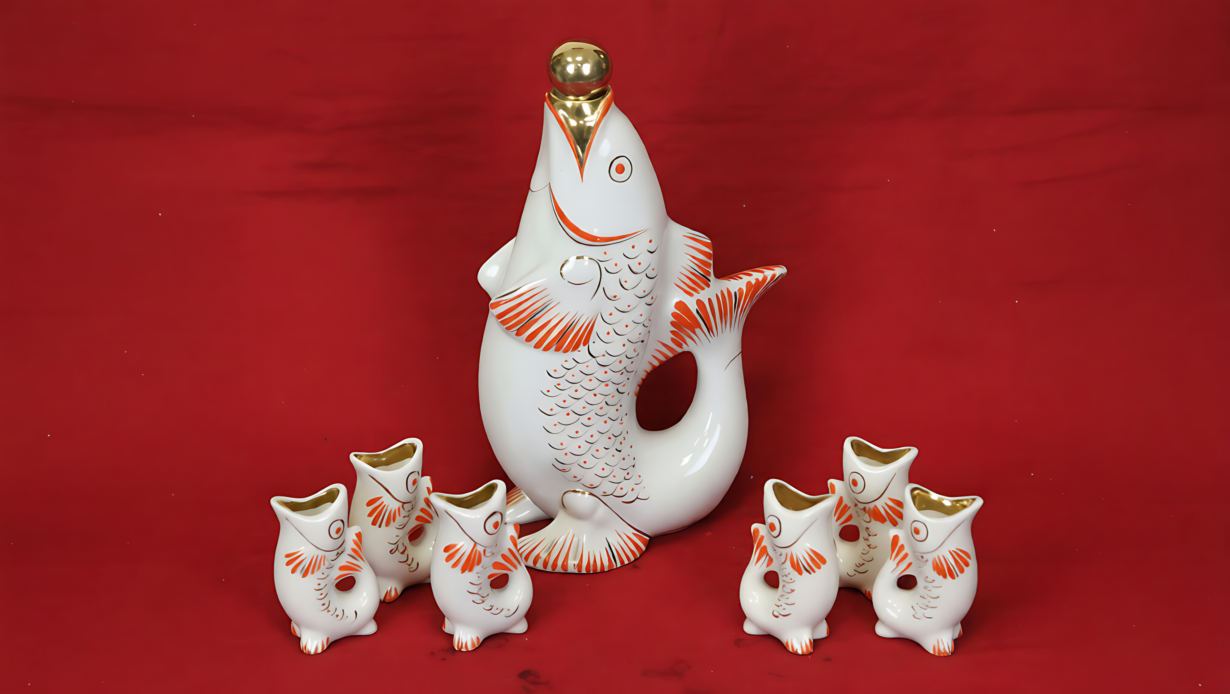 В советских квартирах за стеклом сервантов плавали необычные обитатели — керамические карпы насыщенного синего или алого цвета с позолотой. Семейство состояло из крупной рыбины и шести мальков поменьше. Хозяйки аккуратно смахивали с них пыль, гордо демонстрировали гостям, но использовать по прямому назначению решались редко. Большинство владельцев даже не подозревали, для каких целей был задуман этот предмет. Погружаемся в историю знаменитого комплекта и разбираемся, почему функциональная посуда стала музейным экспонатом в домашних условиях.