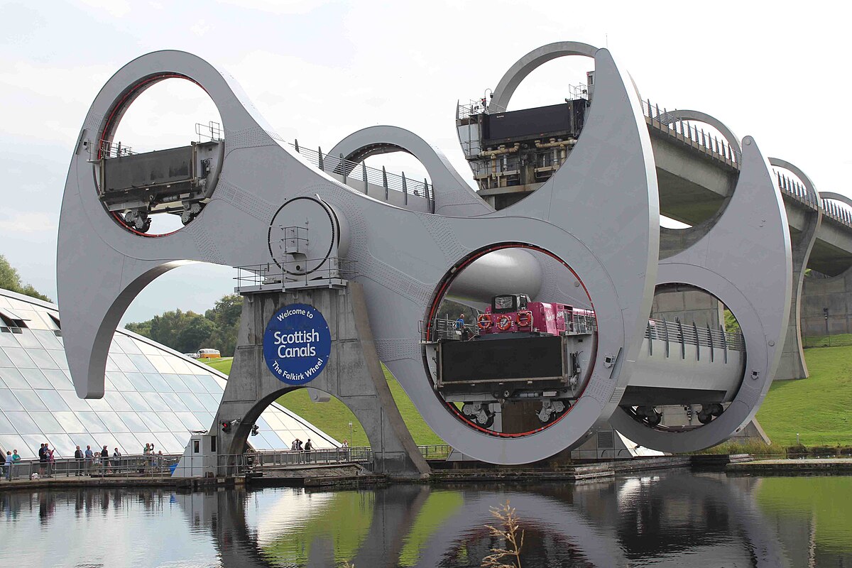 Фолкеркское колесо находится в центральной Шотландии, рядом с одноимённым городом. Это не мост, не шлюз и даже не фуникулёр — а первый в мире и пока единственный вращающийся лодочный лифт. Его задача — соединить два канала: Форт-Клайд и Юнион, между которыми разница в высоте — почти 24 метра. Раньше тут была каскадная система из 11 шлюзов, но она пришла в упадок ещё в XX веке.