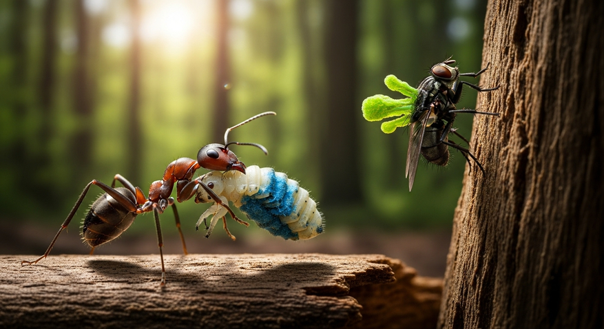 Современные грибы рода Entomophthora muscae демонстрируют аналогичное поведение: они превращают мух в «зомби», заставляя их забираться на возвышенности перед смертью для лучшего распространения спор.