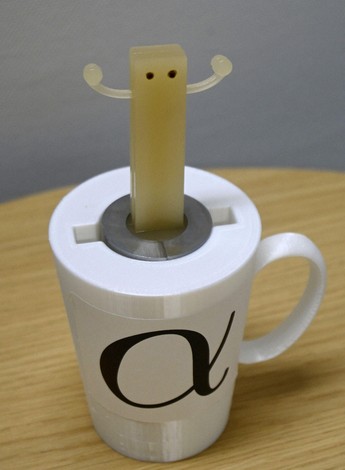 Облачно-желтая прямоугольная фигура съедобного робота, разработанного Есихиро Накатой, доцентом Университета электросвязи, и его исследовательской группой длиной около семи сантиметров, раскачивается из стороны в сторону, размахивая своими желеобразными руками в знак дружеского приветствия, ее тело покоится внутри кружки.