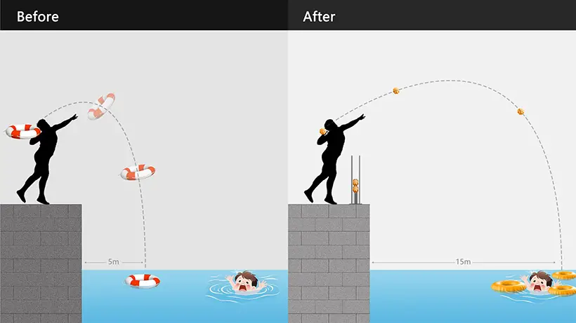 Основное преимущество устройства заключается в возможности точного броска на большие расстояния благодаря компактной сферической форме. Традиционные спасательные круги имеют ограниченную дальность броска из-за своих габаритов и парусности, в то время как сжатая версия обладает лучшими аэродинамическими характеристиками.