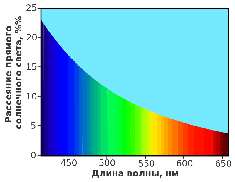 На помощь приходит физика. Как известно, солнечный свет состоит из всех цветов радуги. В атмосфере лучи солнца попадают на молекулы воздуха, а также мельчайшие капли воды, льдинки и пылинки размером гораздо меньше микрона. Эти неоднородности среды изменяют направление распространения световых волн, и свет рассеивается во всех направлениях. Такое явление называется рассеянием Рэлея.