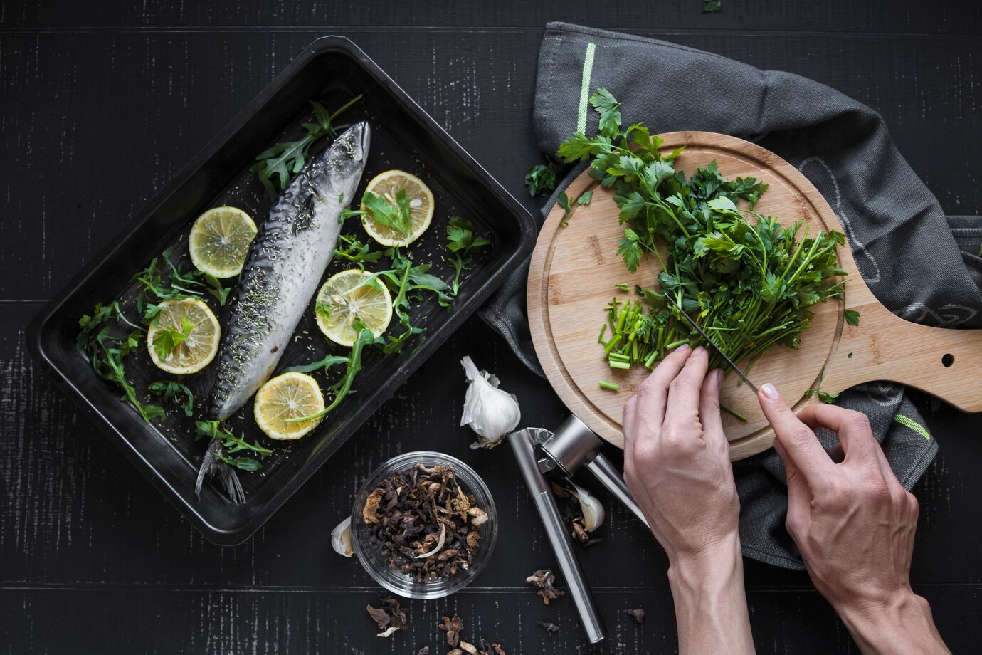 Чеснок и лук. Эти ароматные ингредиенты не только придают вкус, но и создают барьер для запаха рыбы.