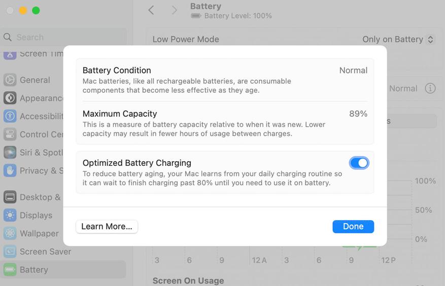 Эта опция доступна с macOS Big Sur. Она сокращает время, в течение которого батарея остается полностью заряженной, так как аккумуляторы не любят ни полной разрядки, ни постоянной зарядки до 100%.