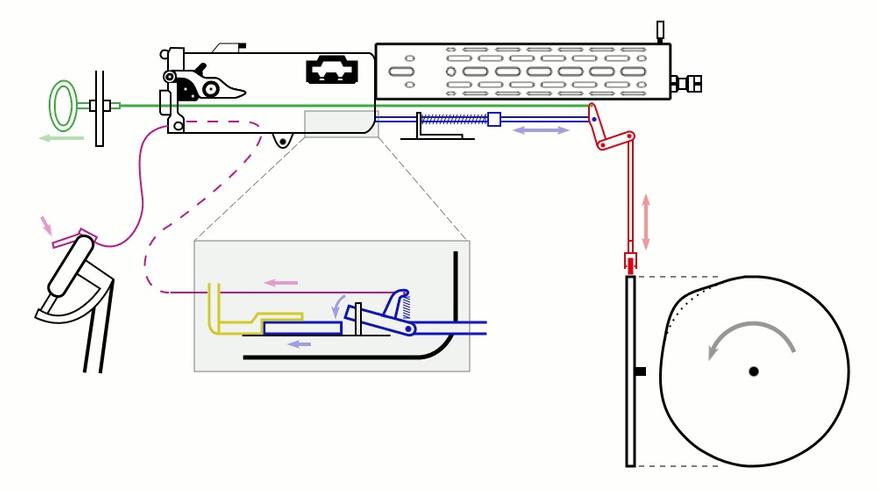 Принцип работы заключался в установке диска с выступом на одной оси с винтом, создавая тем самым простейший кулачковый механизм. В процессе вращения винта, кулачок давит на тягу, соединенную со спусковой частью пулемета. Выстрел осуществлялся после прохождения лопасти винта перед стволом пулемета.
