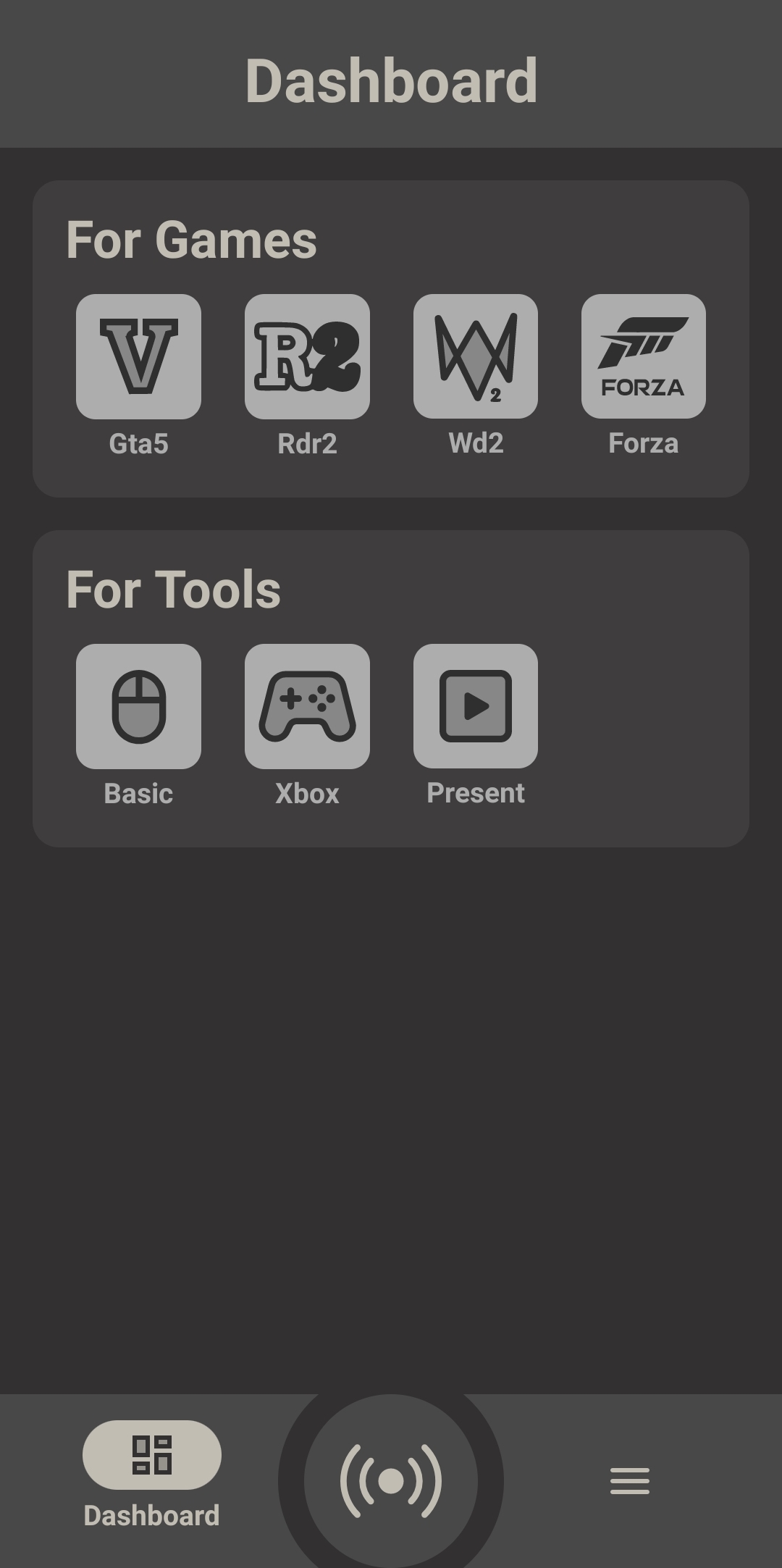 Мобильное приложение предоставляет возможность выбора между эмуляцией клавиатуры и мыши, геймпада Xbox 360 (т. е. посредством XInput — API от Microsoft для управления геймпадами Xbox на ПК) и специализированными раскладками для определенных игр (GTA 5, RDR 2, Watch Dogs 2, серия игр Forza).