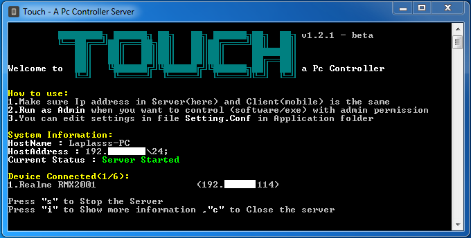 Touch-Server на персональном компьютере использует минималистичный интерфейс командной строки, отображающий количество подключенных устройств, IP-адрес сервера и прочую системную информацию.