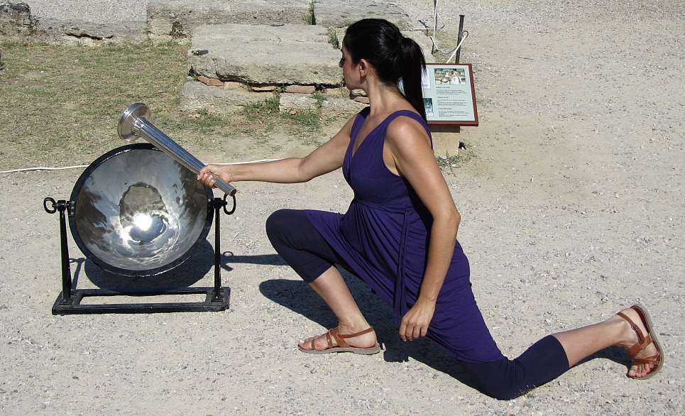 Главным «пиротехническим инструментом» в церемонии зажжения олимпийского огня является параболическое зеркало. Зеркало собирает падающие на него солнечные лучи в точке фокуса и как бы превращается в «концентратор энергии», вся «мощь» которого направляется на факел. Однако создаваемая параболическим зеркалом температура «на выходе» немногим больше ста градусов по Цельсию. А олимпийский факел «заряжен» газом, температура самовоспламенения которого около 450 градусов.