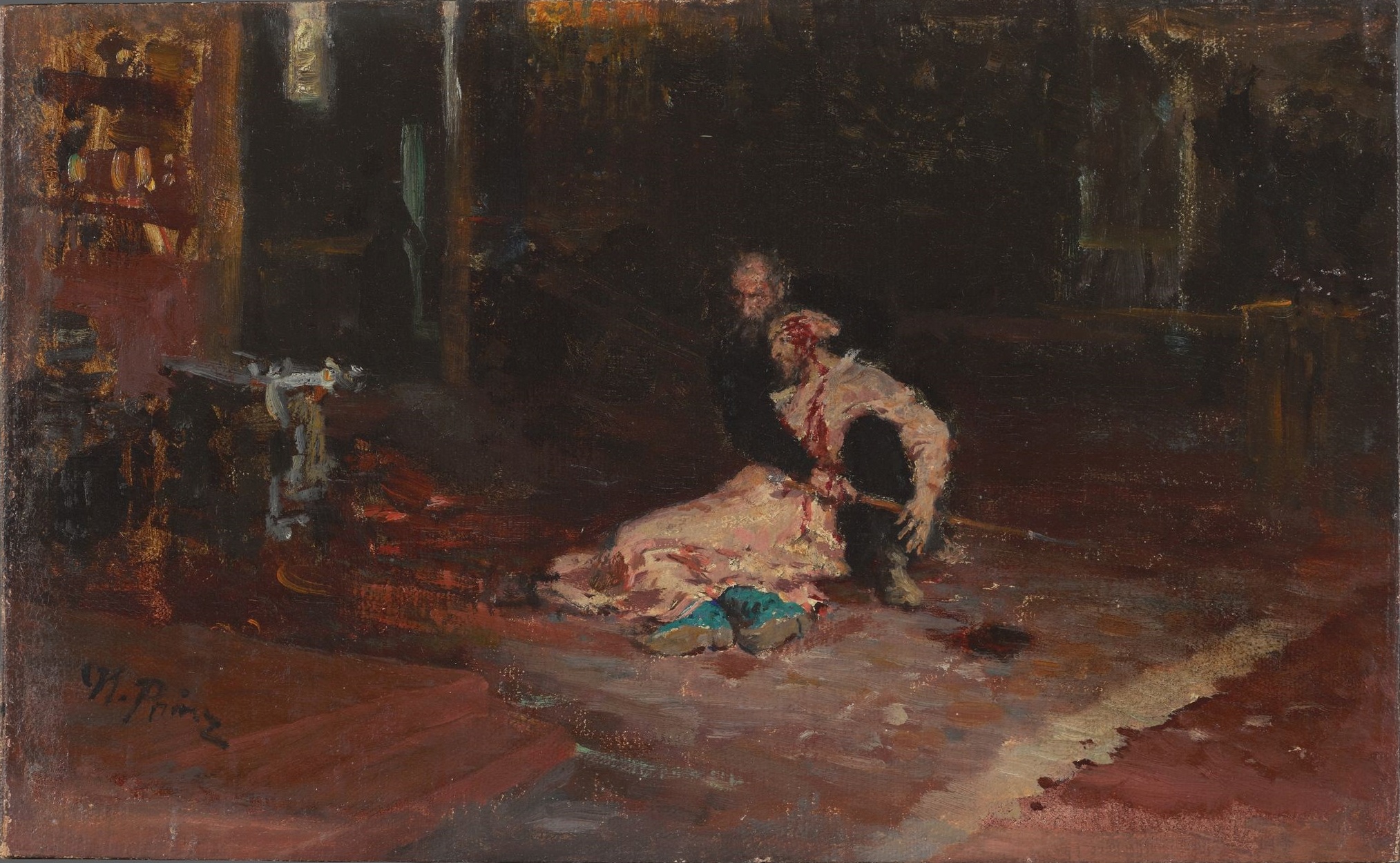 Безусловно, не меньшее внимание было уделено и интерьеру, окружающему главных героев полотна. Однако всё, что располагается «на фоне», было целенаправленно нарисовано Ильёй Репиным в тусклых тонах и полумраке, чтобы внимание зрителей было сфокусировано только на происходящей ситуации — сожалении Грозного о своём необдуманном, но необратимом поступке. Даже предметы интерьера покоев великого князя находятся в хаосе: смятый ковёр, опрокинутый трон и брошенный скипетр.
