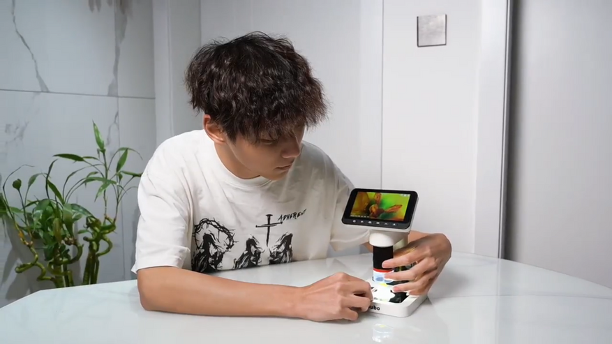 Устройство получило съёмную конструкцию: верхняя часть с камерой и объективом отсоединяется от основания-штатива и может использоваться как самостоятельный ручной микроскоп. В стационарном режиме прибор обеспечивает увеличение от 50 до 400 крат и работает с предметными стёклами, как традиционный лабораторный микроскоп. В ручном режиме увеличение составляет от 50 до 200 крат, при этом исследовать можно любые объекты — от растений и насекомых до текстур поверхностей — без необходимости готовить образцы.
