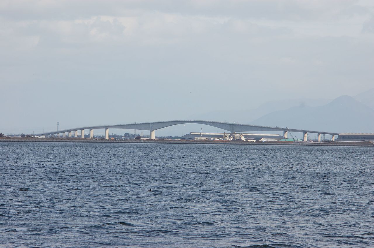 Для начала, наверное, стоит сказать, что это действительно существующий и ныне эксплуатируемый мост, который находится в Японии. Он построен на озере Накауми, и соединяет две префектуры. Его строительство началось в 1997 году, а сдача произошла в 2004 году. Из интересного стоит отметить, что это самый большой мост на жесткой раме в Японии и третий по этой характеристике в мире. До постройки моста Эшима Охаси люди пользовались разводным мостом, который к концу 90-х годов морально устарел, и не позволял перекрыть потребности в транспортном потоке. К тому же при проходе судов движение перекрывалось на 7-8 минут, в по старому разводному мосту не могли двигаться транспортные средства весом более 14 тонн.