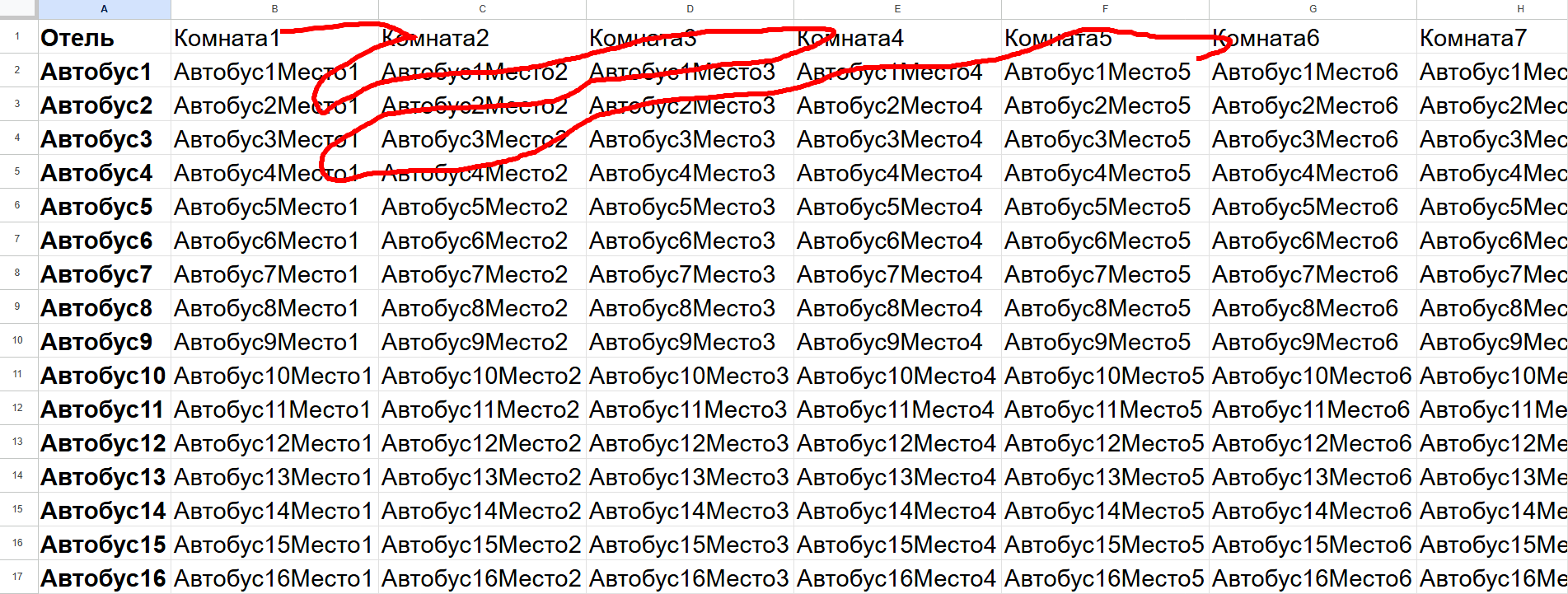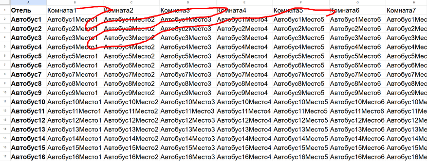 Ваши навыки работе в Excel бесконечно совершенны, поэтому вы открываете бесконечную таблицу, которая поможет разместить всех постояльцев. В первом ряду у вас записаны все постояльцы отеля. А в каждом ряду (кроме первого) вы записываете номер автобуса. В колонках вы указываете номера отеля.
