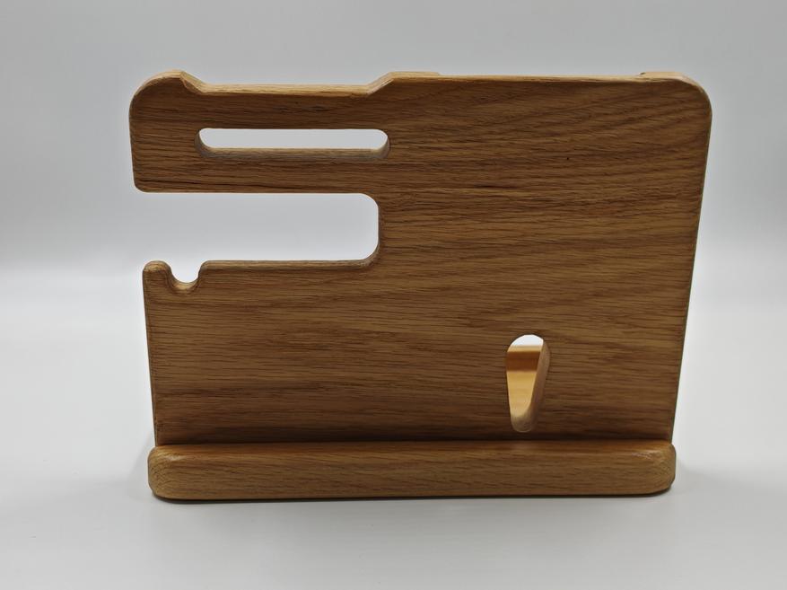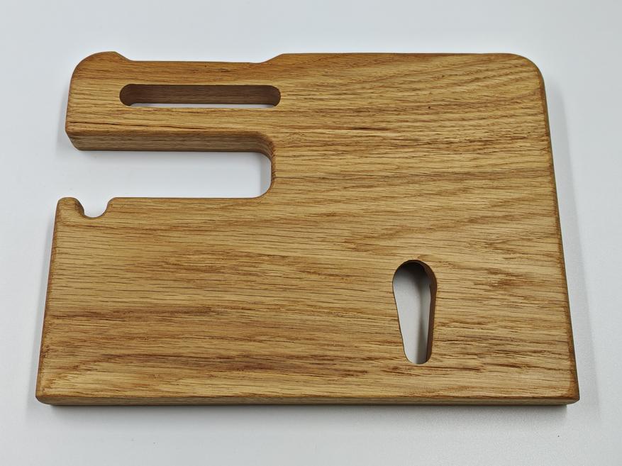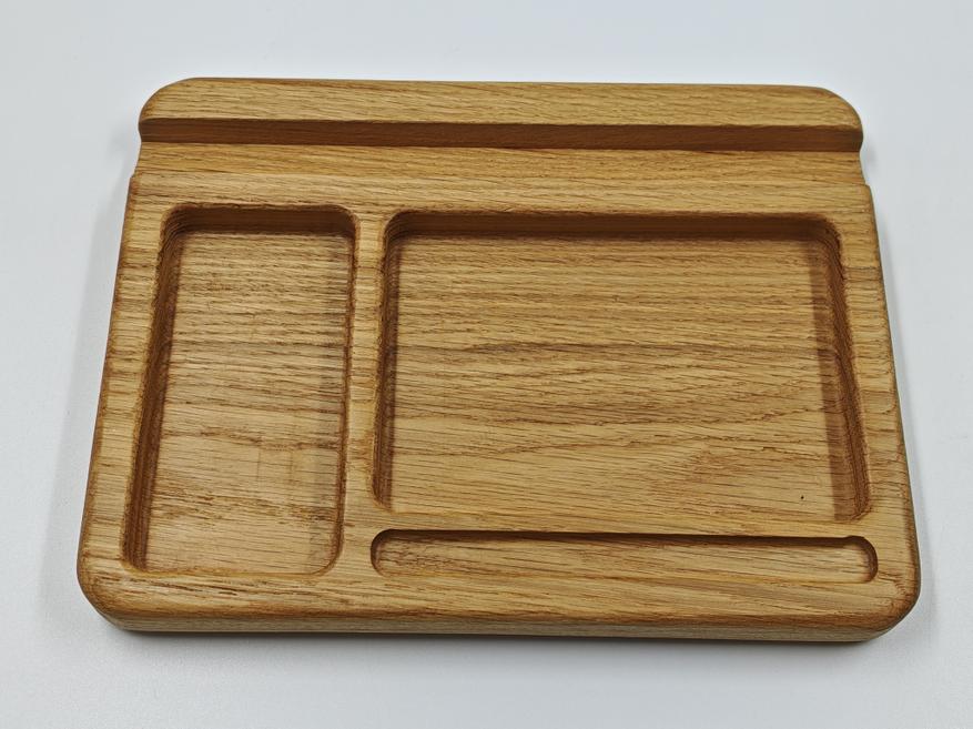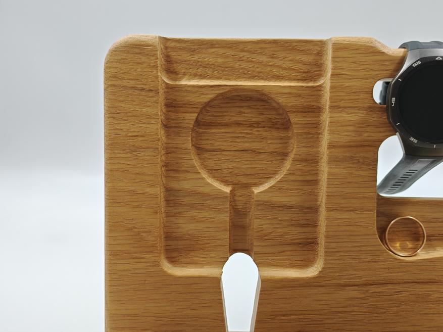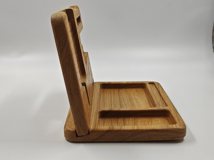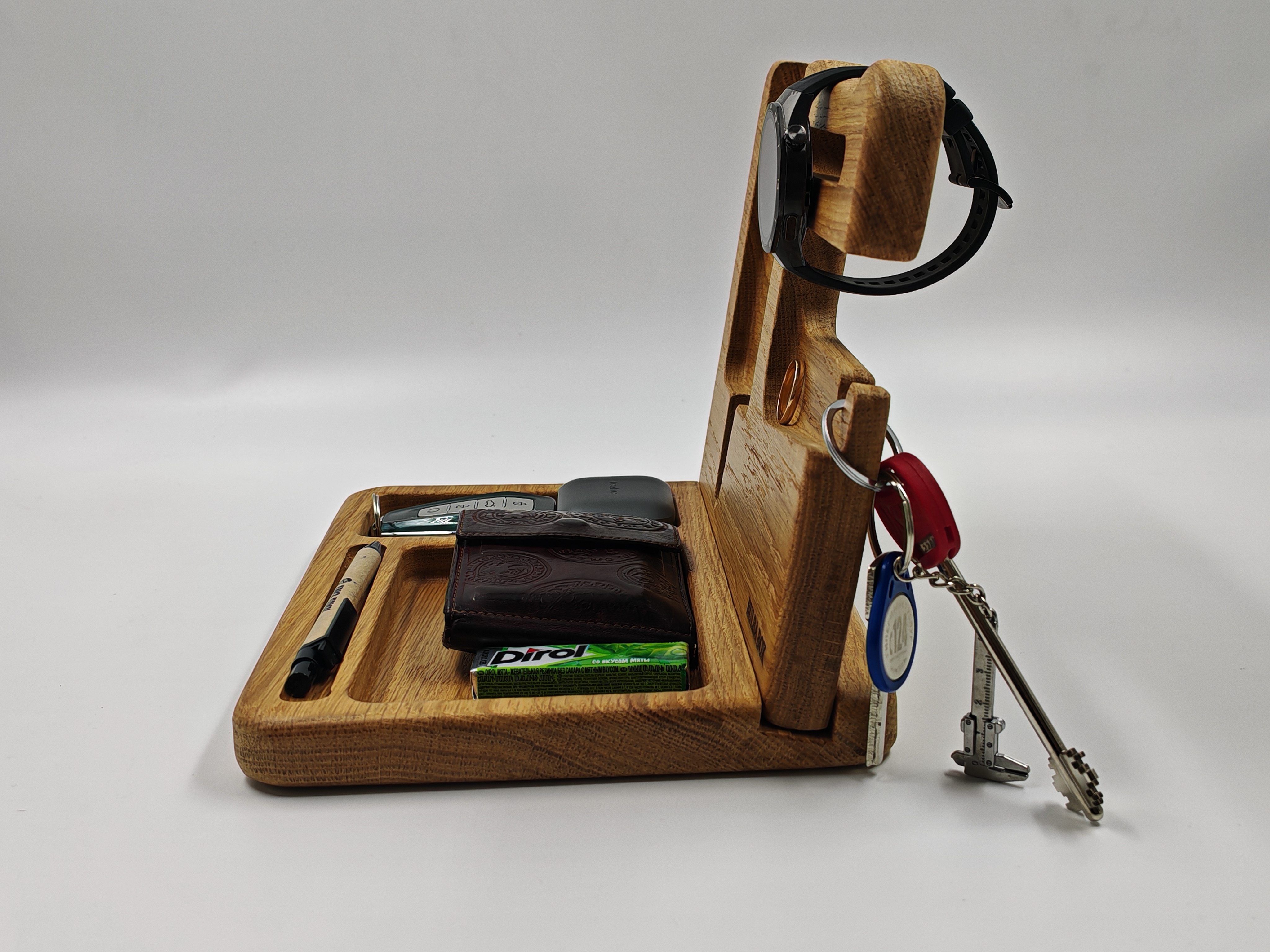 В итоге это не какая-то сложная или технологичная вещь, а простой органайзер для рабочего стола, который делает повседневную жизнь немного удобнее. Все вещи лежат в одном месте, ничего не теряется, стол выглядит чище и аккуратнее. За счёт размеров он вмещает всё, что обычно носишь с собой, и при этом не выглядит громоздким. К плюсам отнес бы материал — массив дуба. А основной недостаток это немалая цена, но ручная работа обычно дешево и не стоит.