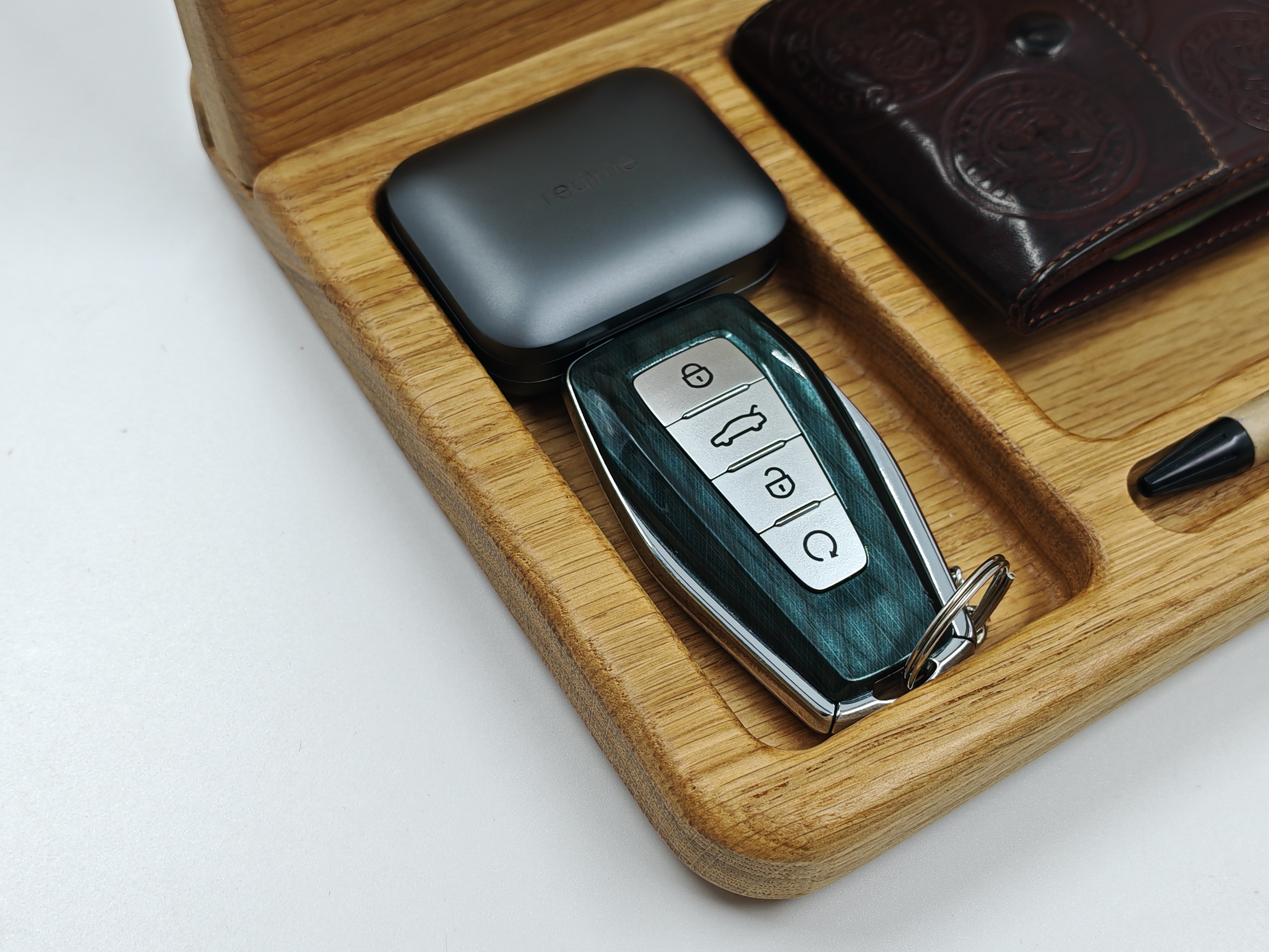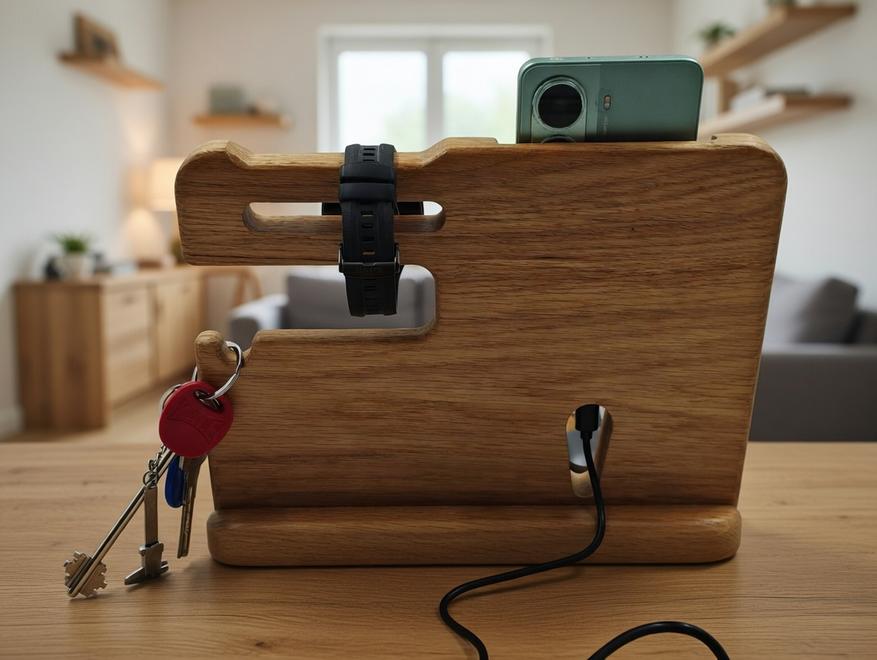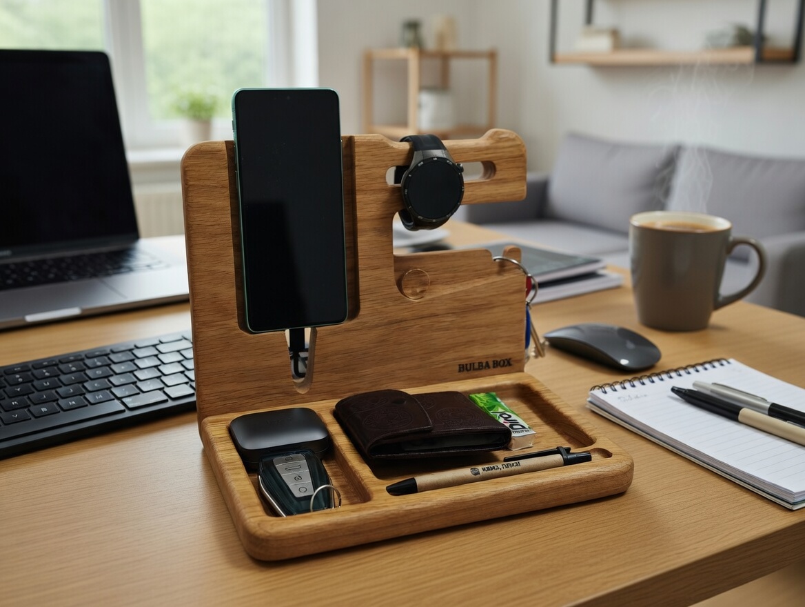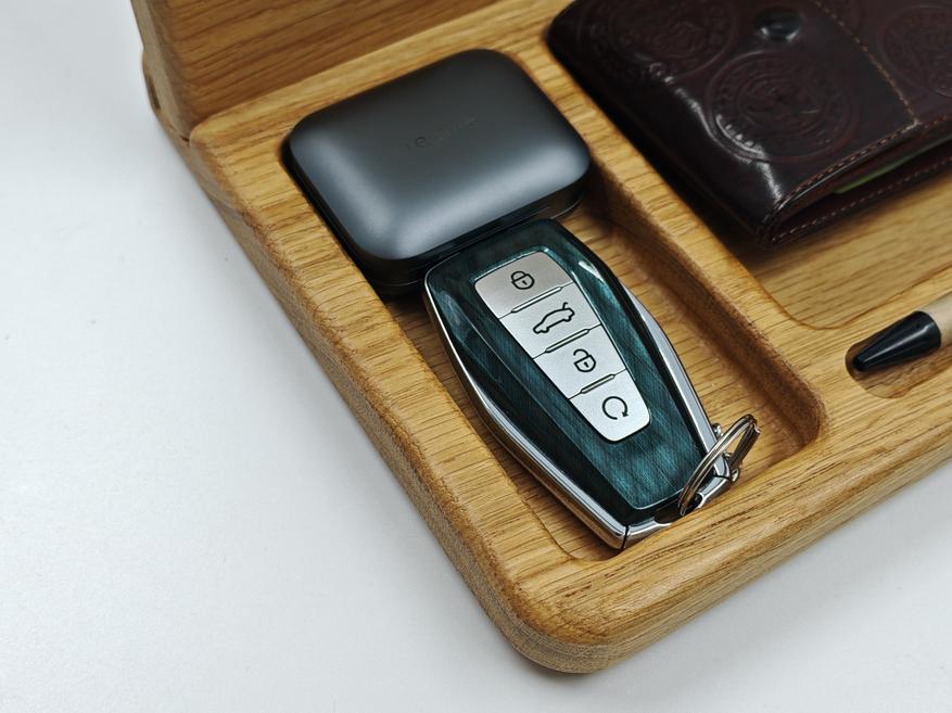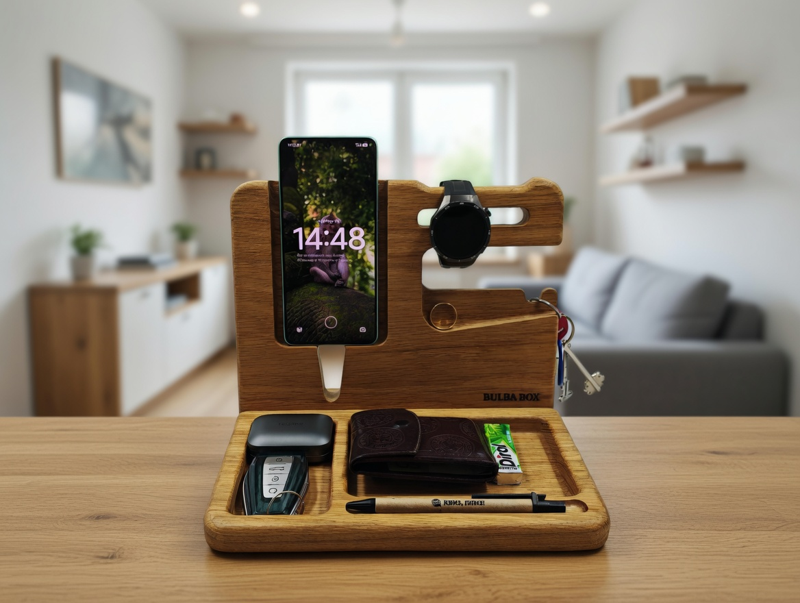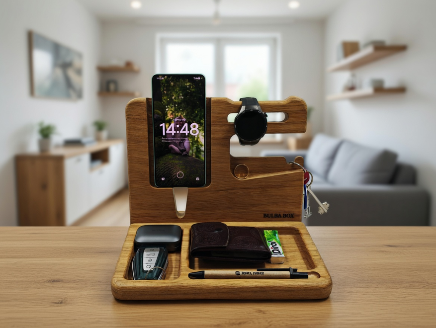 На обзоре органайзер из массива дуба от Bulba Box. По сути это место, куда в конце дня складываешь всё, что обычно валяется по карманам: телефон, ключи, наушники, часы, мелочь. И утром ты не тратишь время на поиски, потому что всё лежит в одном месте. Использую органайзер уже полтора месяца и готов поделиться своими впечатлениями. Вещь вроде бы и простая, но адаптирована под современные нужды.