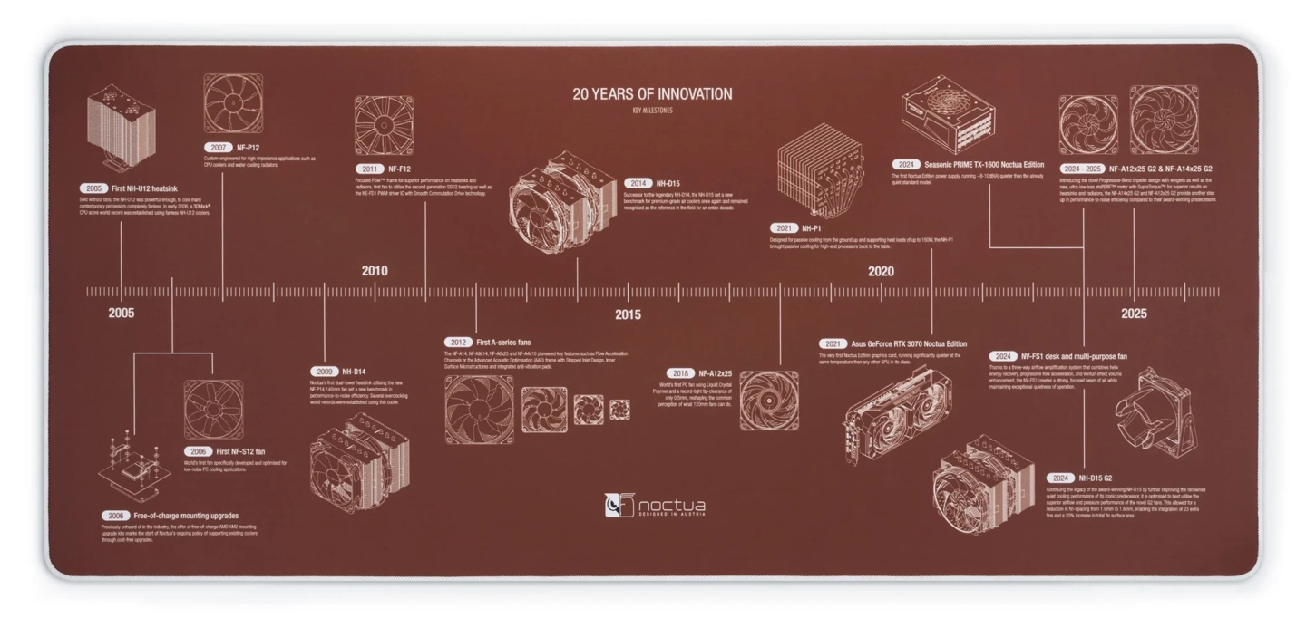 Австрийский производитель систем охлаждения Noctua провел редизайн официального веб-ресурса и анонсировал настольный коврик NP-DM3 в честь двадцатой годовщины деятельности компании. Информация появилась 24 октября 2025 года в публикации технологического издания Igor's Lab.