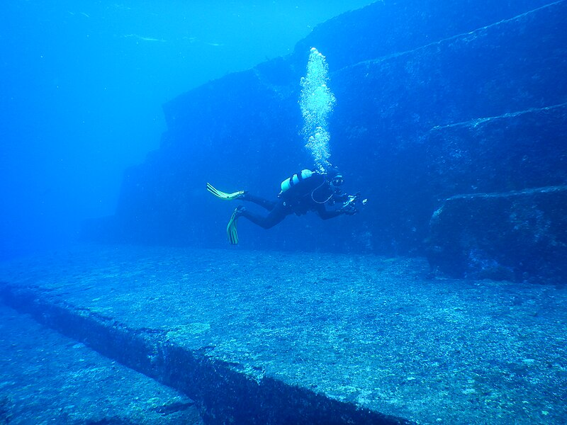 У берегов острова Йонагуни на глубине 5-40 метров были обнаружены массивные каменные образования: платформы с террасами и ступенями, прямые стены, колоннообразные структуры, объекты, напоминающие дороги и бассейны. Геометрические формы (прямые углы, параллельные линии) кажутся неестественными.