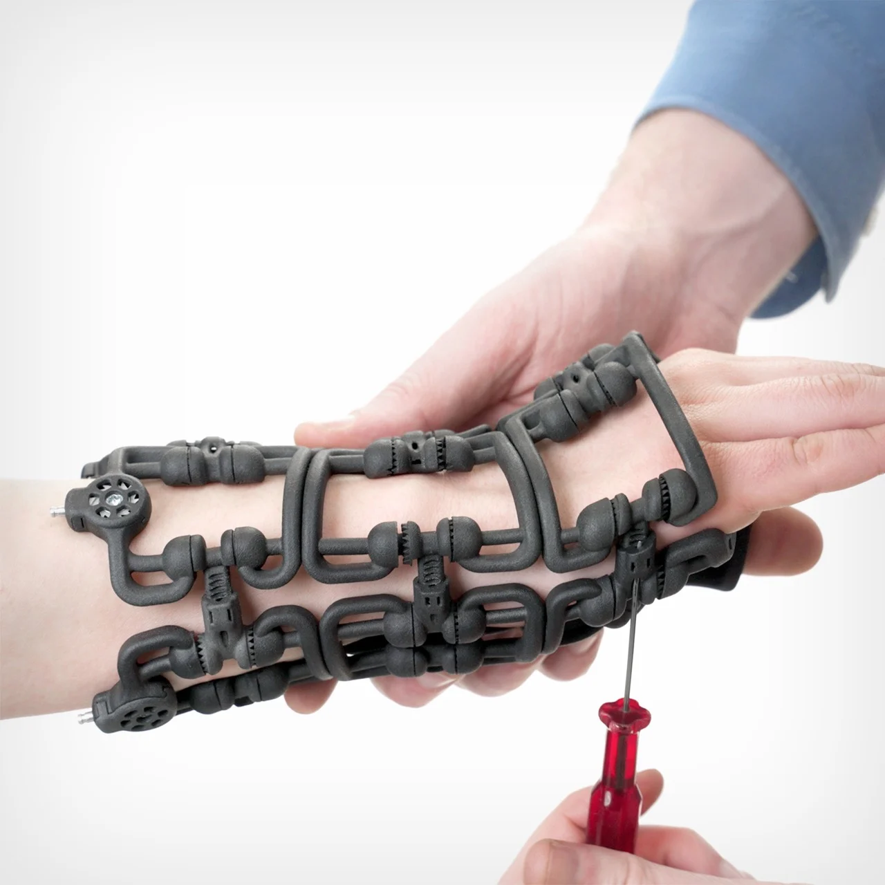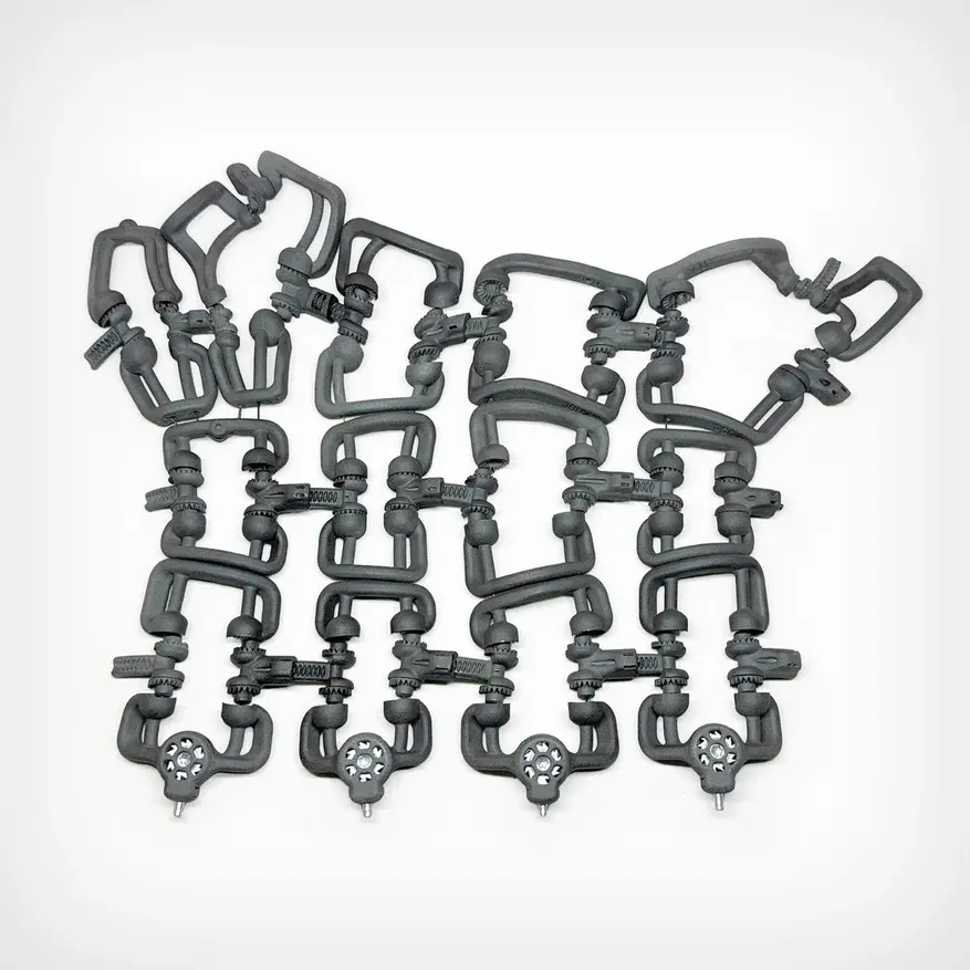 Каркас фиксатора изготавливается методами 3D-печати SLS и MJF из медицинского нейлона 12. Точки повышенной нагрузки усилены алюминием и нержавеющей сталью, обработанными на станках с ЧПУ. Кевларовые тросы натягиваются встроенными регуляторами, заимствованными из яхтенного такелажа, где распределённые точки натяжения создают структурные нагрузки.