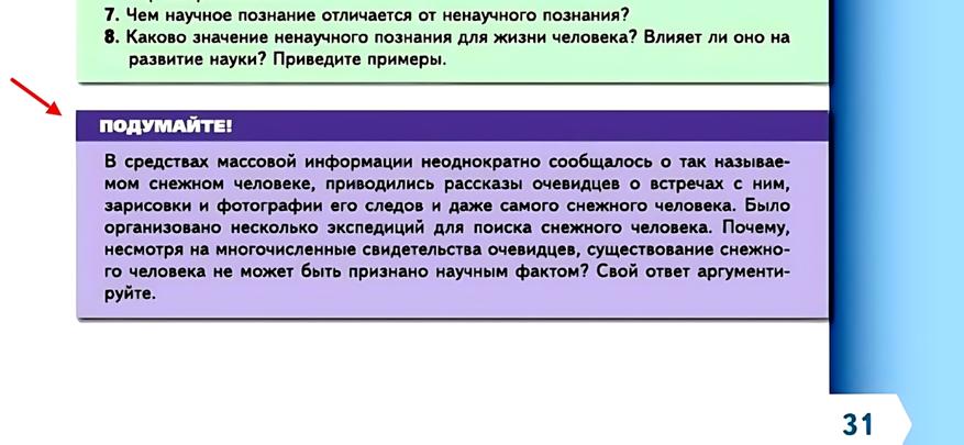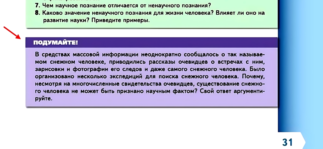 Мы серьезно просим ученика 5 класса опровергать существование Йети? В самом параграфе нет инструментов для научного ответа (там не рассказывают про критерии фальсифицируемости или методы доказательной науки). То есть ребенок должен опираться на что? На свои догадки? Или пересказывать сюжеты передач с РЕН-ТВ? Мне кажется, в 10 лет важнее разобраться, как работает клетка или фотосинтез, а не обсуждать газетные утки на уроке биологии.