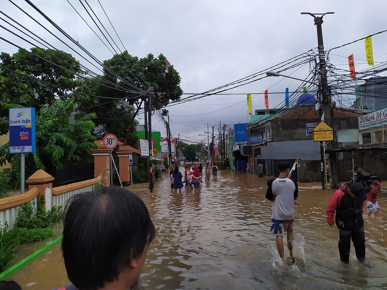 Вторым важным фактором является география города. Джакарта расположена на болотистой дельте и пересечена 13 довольно крупных рек, которые несут воду с горных районов к Яванскому морю. Такое расположение изначально делает её уязвимой для наводнений, что в принципе и случается, несмотря на наличие большого количества отводных каналов.