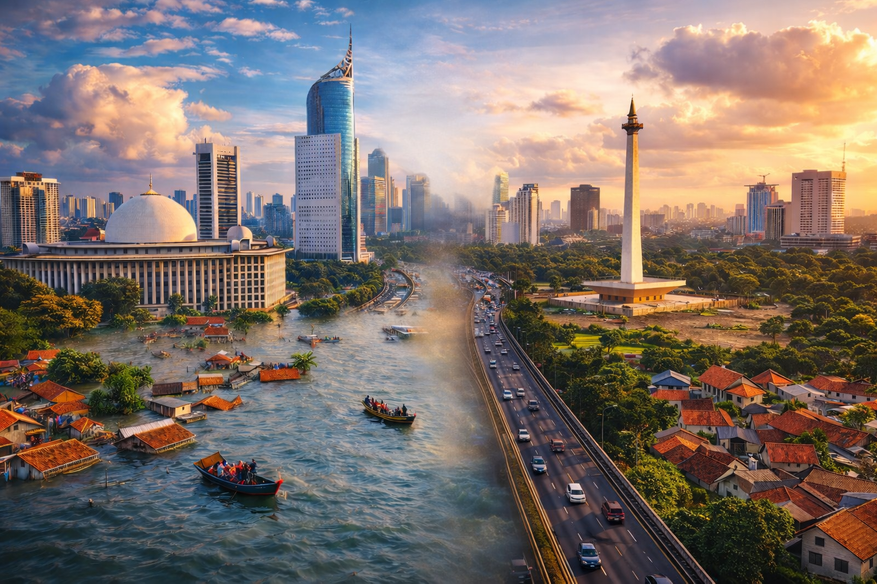 Сегодня около 40 % территории Джакарты уже находится ниже уровня моря. Это делает город крайне уязвимым перед штормами и повышением уровня океана. Но как мы знаем по опыту Нидерландов, с водой вполне успешно можно бороться, однако такие проекты требуют колоссальных финансовых затрат. Интересно, что по странному стечению обстоятельств Джакарта была 300 лет колонией Нидерландской Ост-Индией, а сейчас они имеют схожие проблемы с отвоевыванием суши у воды.