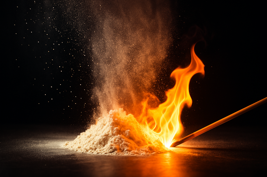 На первый взгляд заголовок может показаться каким-то кликбейтом, но это правда — мука действительно в определенных условиях легко воспламеняется и даже может привести к мощному взрыву. Именно поэтому мукомольные комбинаты и хлебозаводы относятся к категории опасных предприятий из-за наличия в них взрывопожароопасной среды. Давайте разберемся, почему мука может гореть и взрываться, и как этого избежать.