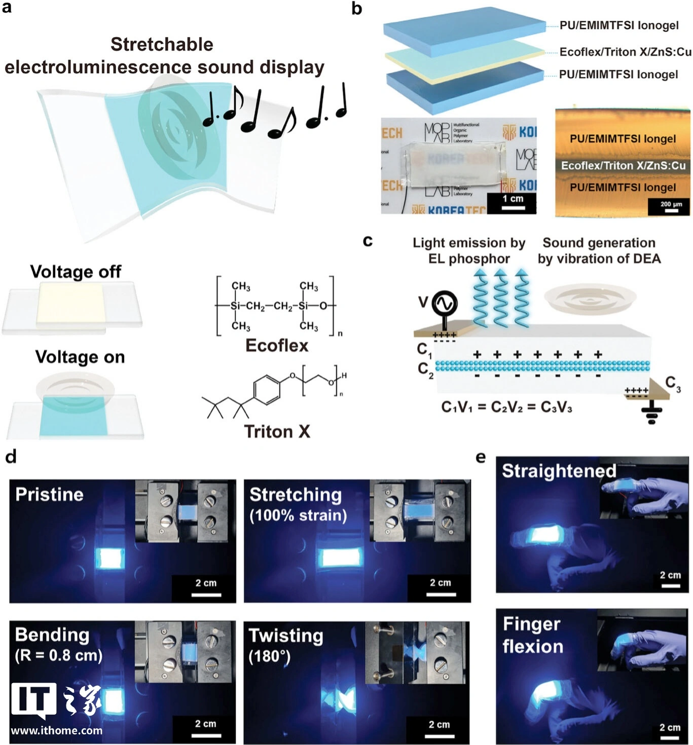 Композитный материал состоит из трех важных компонентов (Ecoflex, Triton X и неорганического электролюминесцентного люминофора), а инновационная технология отображения звука и света позволяет легко преобразовывать звуковую информацию в оптические сигналы. Исследователи успешно разработали это акустооптическое устройство отображения, используя прозрачные ионно-гелевые электроды и слой с высоким содержанием диэлектрика, состоящий из Ecoflex, Triton X и неорганических электролюминесцентных люминофоров.