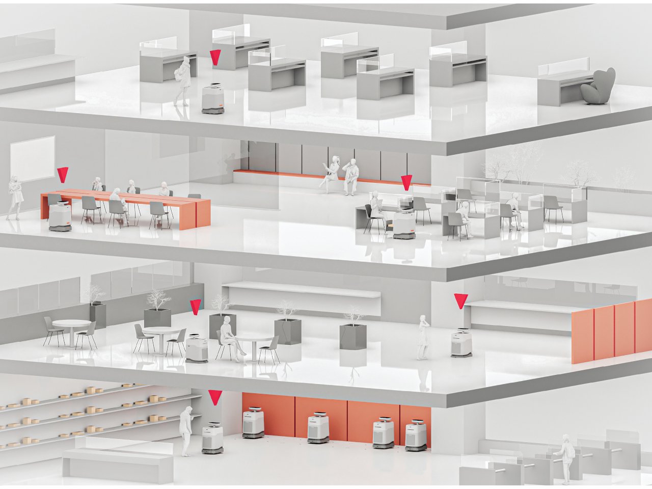 Система предусматривает использование персонализированных карт доступа для идентификации пользователей и обеспечения безопасности операций. Робот возвращается на специальную док-станцию для зарядки, которая размещается на первом этаже здания. Концепция поддерживает координацию нескольких устройств в рамках одного офисного комплекса для одновременного выполнения различных поручений от разных сотрудников.