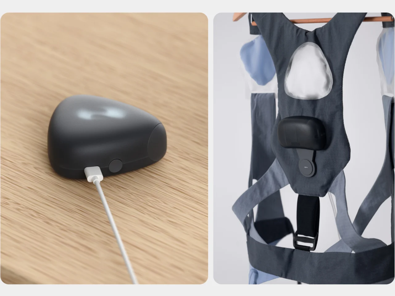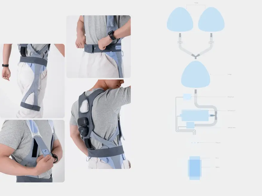Конструкция устройства состоит из системы широких ремней, охватывающих плечи, торс и бёдра. На спине, в районе поясницы, расположен основной модуль, в котором находятся датчики движения, микроконтроллер, воздушный насос с клапанами и датчик давления. Система ремней выполнена из мягких материалов синего и серого цветов и оснащена точками крепления для рабочих инструментов, что позволяет интегрировать устройство в повседневную экипировку.