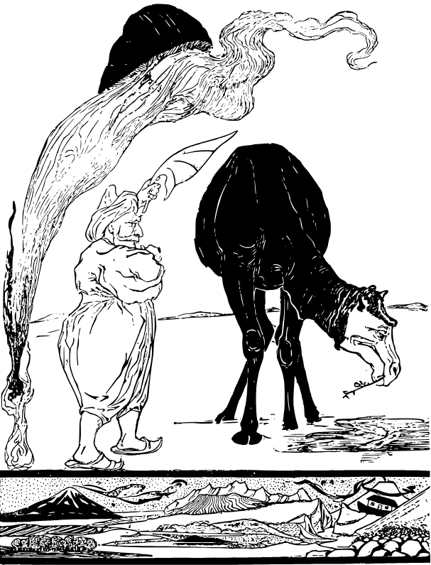 Для понимания следующих описаний привожу краткий пересказ: верблюд ленился и не хотел работать, остальные животные разозлились на него, нажаловались человеку, но тот не захотел им помогать. Затем они пожаловались джинну, а он уже наградил верблюда горбом, чтобы животное могло работать три дня без еды и воды.