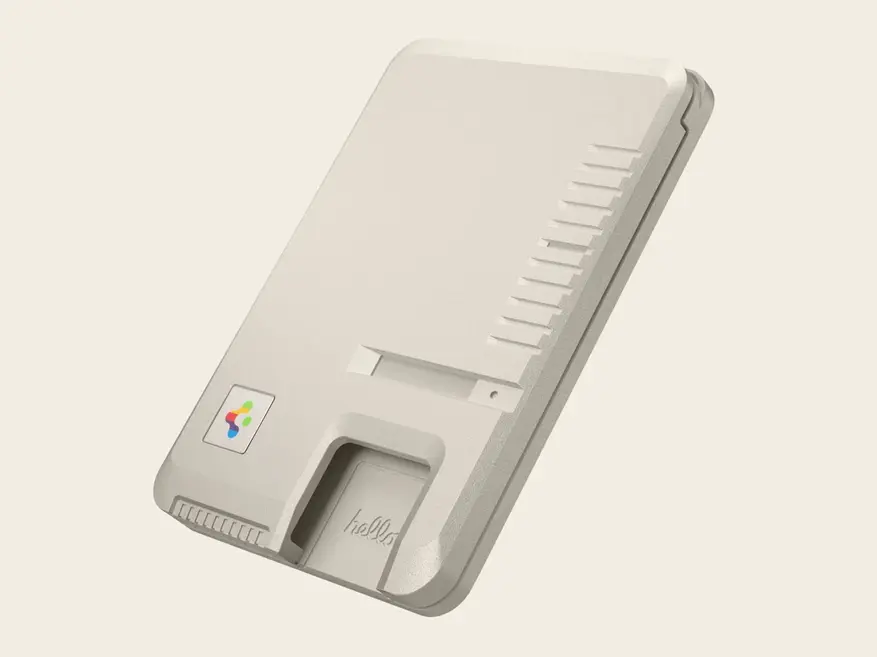 Аксессуар выполнен в бежевом цвете Stone и воспроизводит характерные элементы оригинального Mac. На корпусе кошелька расположены вертикальные бороздки, имитирующие вентиляционные отверстия компьютера, декоративный элемент в виде 3,5-дюймовой дискеты на месте бывшего дисковода, радужный логотип Apple того периода и углубление с надписью «hello».
