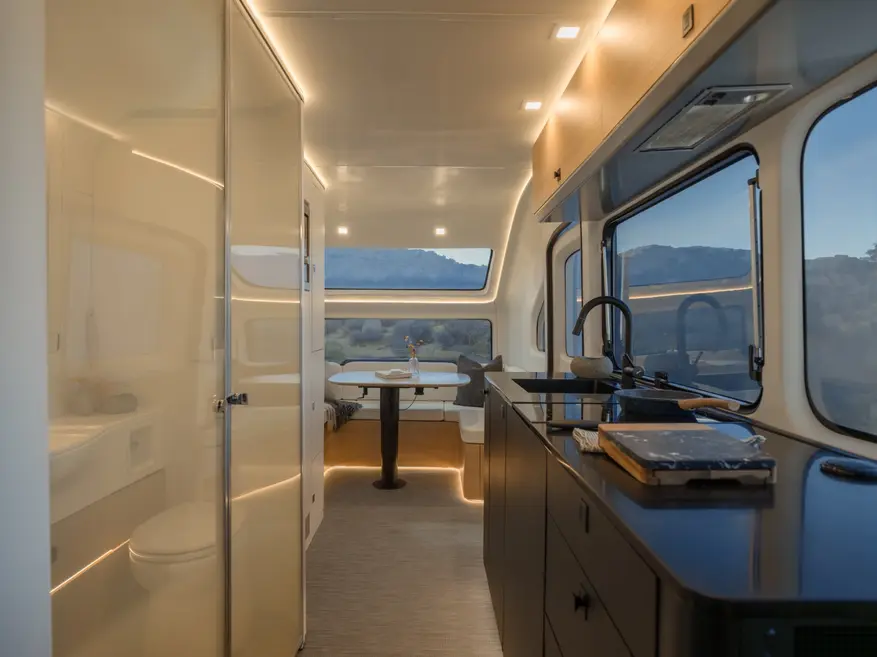Длина Pebble Flow составляет 7,5 метров. Внутри расположены обеденная зона с U-образным диваном, трансформируемая в двуспальную кровать, кровать-трансформер в задней части, сухая ванная комната с душевой кабиной, полностью оборудованная кухня с индукционной плитой и система климат-контроля. Предусмотрена возможность подключения Starlink.