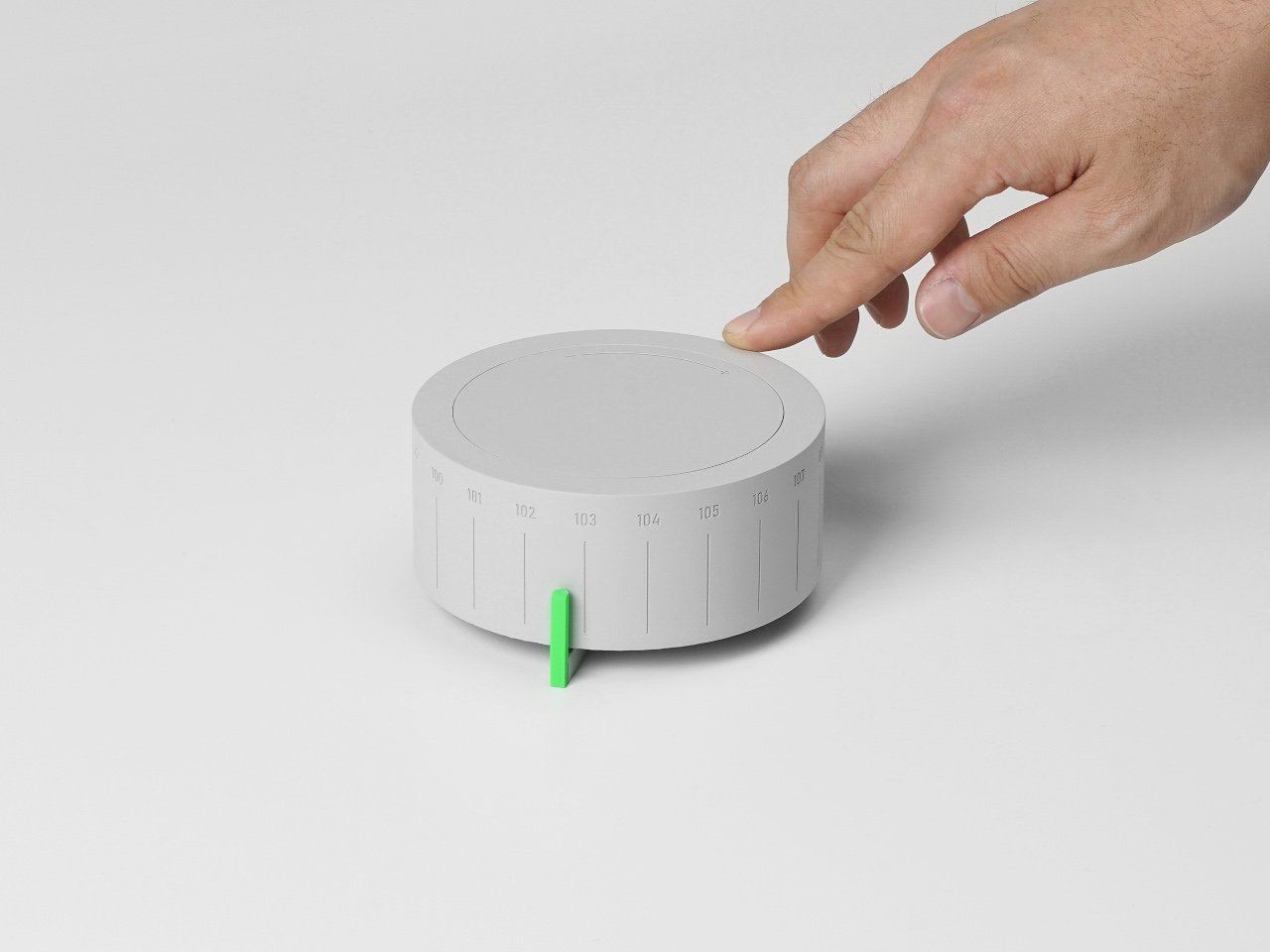 Цифровое радио Wheel управляется поворотом всего корпуса устройства. Цилиндрический корпус с ребристой поверхностью поворачивается для настройки частоты. Физический индикатор на корпусе показывает выбранную станцию. Устройство выполнено в зелёных тонах.