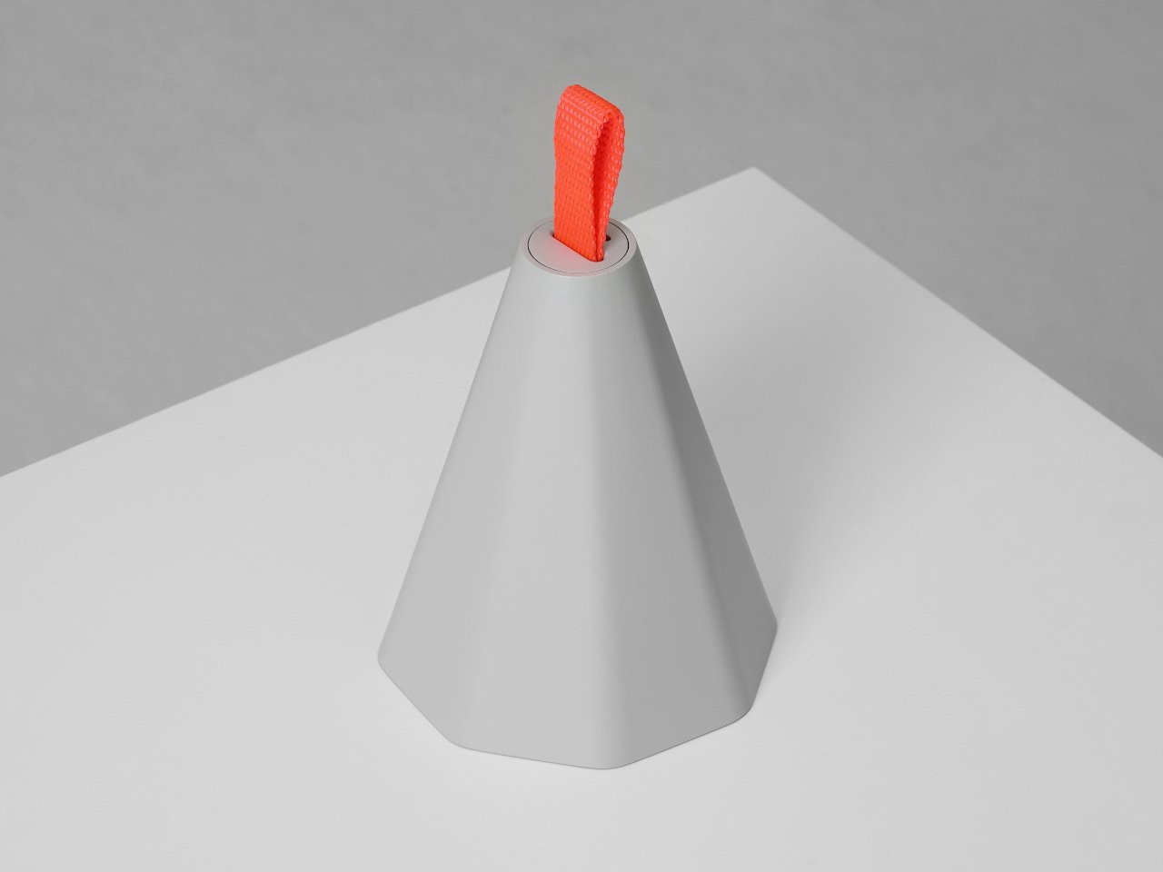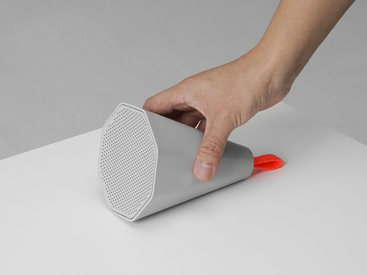 Bluetooth-колонка Cone активируется при переворачивании корпуса. Встроенный датчик гравитации регистрирует изменение положения устройства и включает или выключает воспроизведение. Колонка выполнена в форме конуса с оранжевым акцентом на вершине.