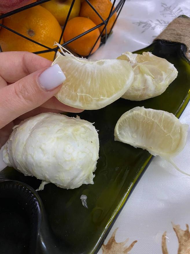 Этот фрукт поначалу показался мне настоящей загадкой: как справиться с его толстой кожурой? Но со временем я нашла удобный способ, которым теперь с удовольствием делюсь. Сначала я аккуратно снимаю кожуру — она плотная и толстая, поэтому очищать её нелегко, но это того стоит. Затем разделяю фрукт на дольки и обязательно удаляю все белые плёнки, потому что именно они дают ту самую горечь. Когда всё очищено, остаются только сочные и сладкие дольки, которые просто тают во рту!
