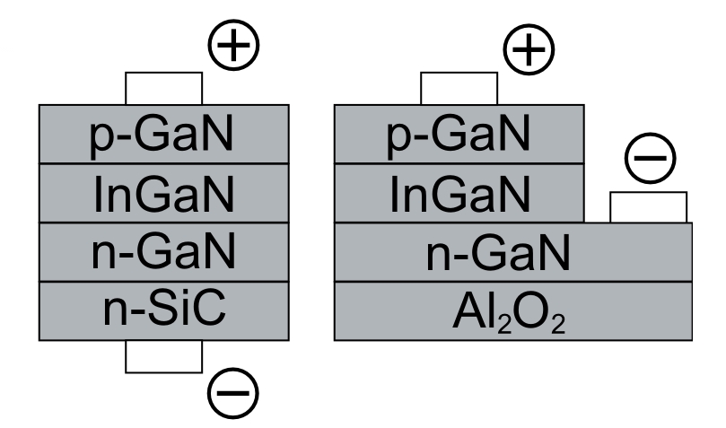 Накамура применил и усовершенствовал структуру с двойной квантовой ямой (Double-Heterostructure). Между слоями p-GaN и n-GaN был добавлен ультратонкий (единицы нанометров) активный слой из нитрида индия-галлия (InGaN).