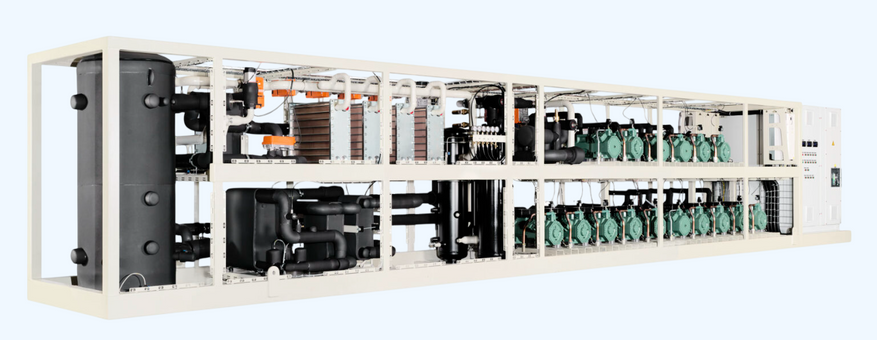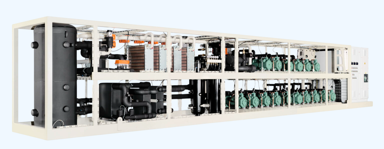 Новые тепловые насосы используют R744 (CO2) в качестве хладагента и имеют размеры 18 x 1,6 x 2,26 м при весе до 33 000 кг, в зависимости от конфигурации проекта.
