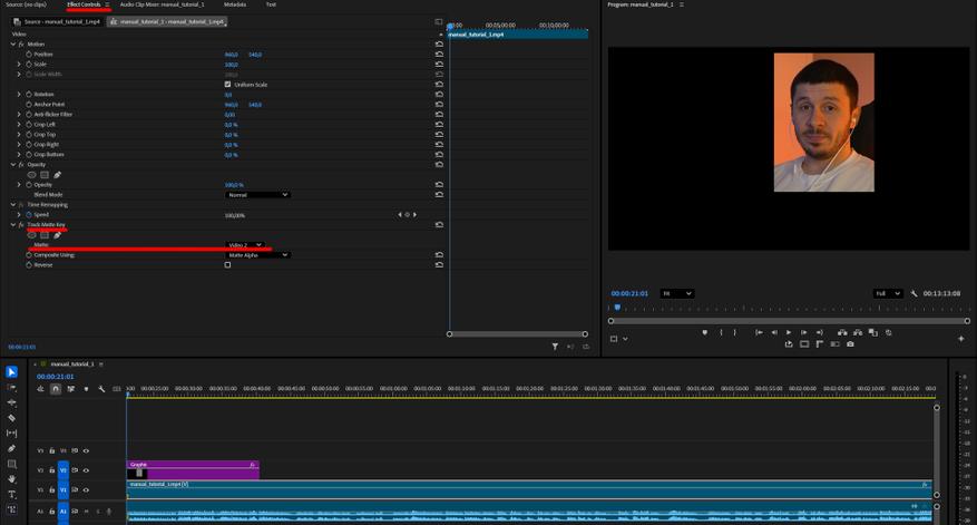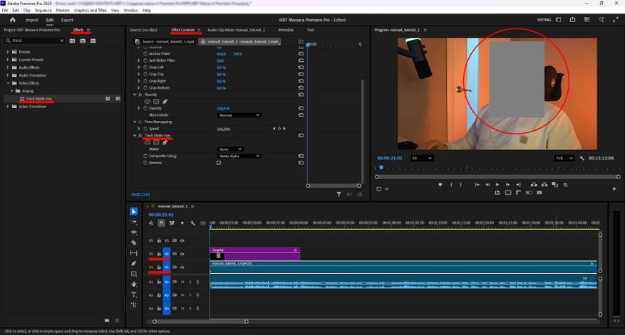 - В панели Effects найдите эффект Track Matte Key и примените его к клипу на дорожке V1.