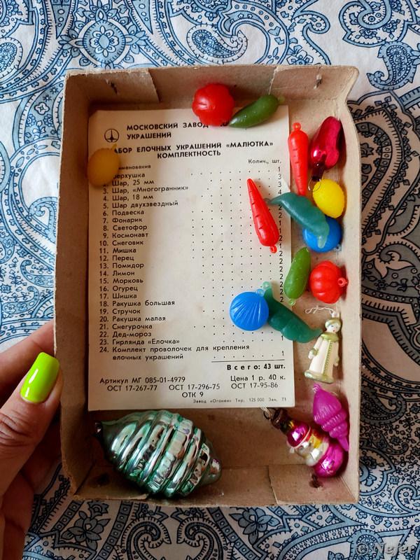 Еще найдены миниатюрные игрушки на маленькую елку, называется "Набор елочных украшений МАЛЮТКА". Производил их Московский завод елочных украшений. Стоимость набора - 1 руб. 40 коп. Всего было 42 предмета и проволочки для крепления. К сожалению, стеклянных осталось лишь несколько, в основном сохранились только пластиковые овощи-фрукты. Помидор, огурец, морковь, горох, лимон, перец и - внезапно - ракушки.
