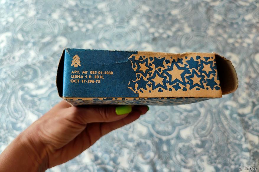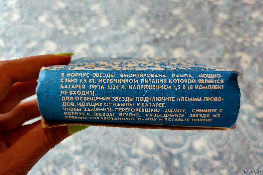 В моем детстве на верхушке елки была ярко-красная звезда. Пластиковая, с узорами. Вечером можно было погасить свет и включить ее, она красиво светилась. Удивительно, но сохранилась даже коробочка. Изготовитель: Фабрика художественных изделий. Цена 1 руб. 50 коп.