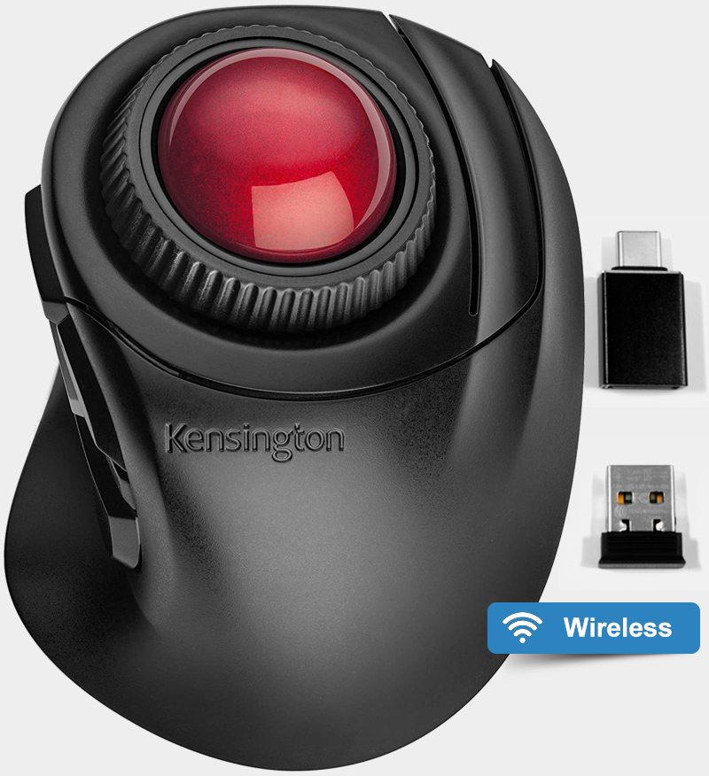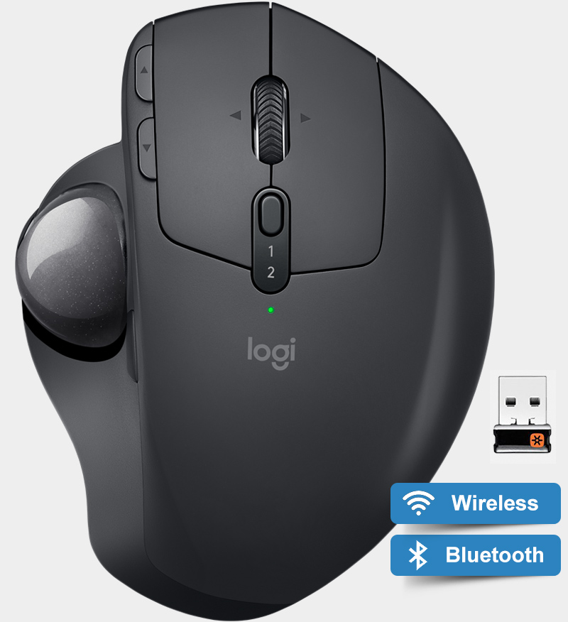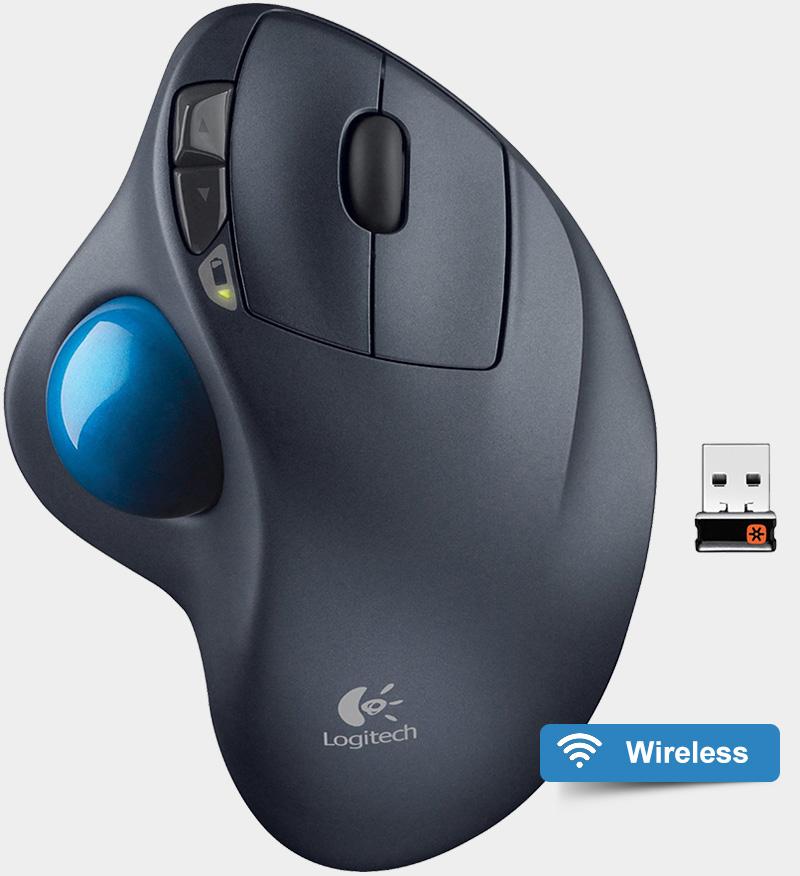 Беспроводной трекбол для правшей, под большой палец с лазерным датчиком и пятью кнопками, включая дополнительные программируемые кнопки возле ЛКМ. Управление курсором осуществляется большим пальцем, а трекбол остаётся на месте, экономя пространство на столе и снижая нагрузку на запястье. Связь по радиоканалу 2,4 ГГц через мини-USB-приёмник Unifying, он обеспечивает надёжную работу до 10 м, а батарея AA работает до18 месяцев. Эта модель часто отмечается за удобство при длительной работе, среди ценителей трекболов под большой палец.
