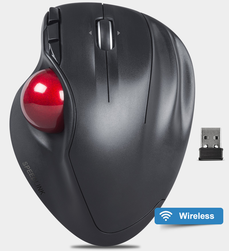 Трекбол рассчитанный для большого пальца, с большим шаром, что не характерно для моделей под большой палец. Подключение происходит по радиоканалу 2,4 ГГц, трекбол базируется на лазерном сенсоре до 1600 DPI. На корпусе предусмотрено пять кнопок и колесо прокрутки, но переназначение клавиш штатно не поддерживается: отдельного программного обеспечения от Speedlink нет, устройство работает на стандартных драйверах.