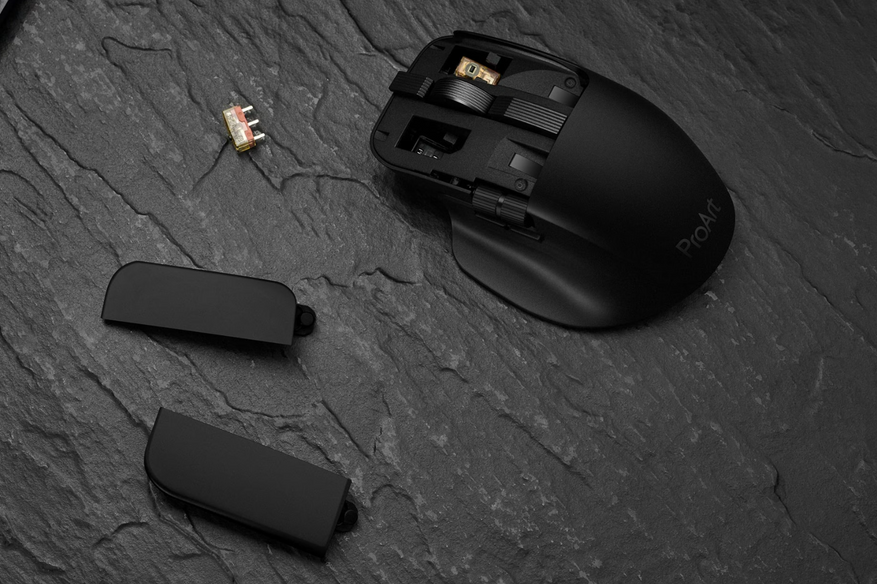Модель позиционируется как универсальная мышь для работы и творчества. Одной из ключевых особенностей стала модульная система кнопок. Пользователь может самостоятельно выбирать тип переключателей, устанавливая оптические элементы, микропереключатели либо сочетая оба варианта в одной конфигурации. Такой подход позволяет адаптировать устройство под разные сценарии использования.